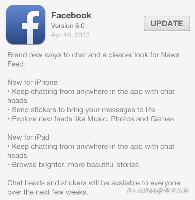 Also important: Facebook has made it clear in the app update notes we're seeing here that Chat Heads will be made available to all users (on iOS, we must assume) in the coming week. Just wait your turn, iPad users!