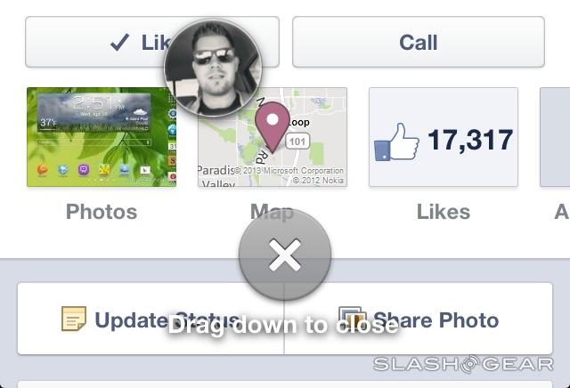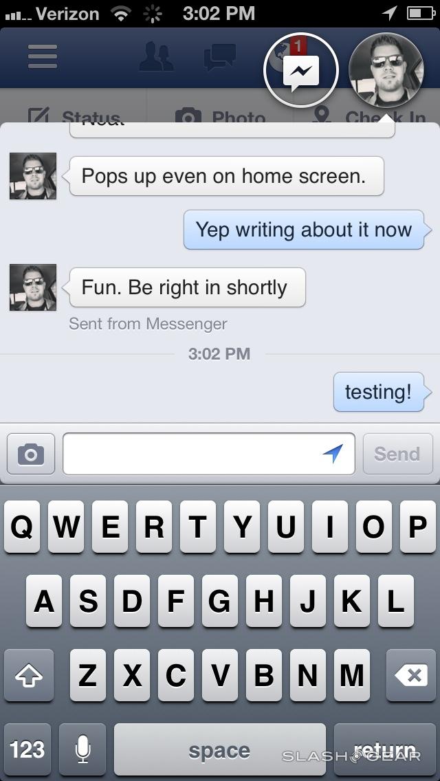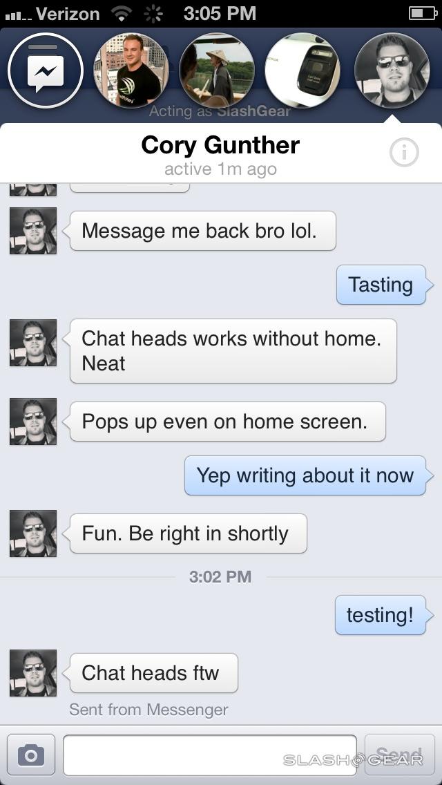 What you've got here is Facebook's Chat Heads messaging environment stuck inside the Facebook app itself – as long as you never leave the Facebook app, you've got the same thing as you'd have been working with in Android (essentially). See our full Facebook Home review for Android right this minute! While the Android version of Facebook's messenger experience in Chat Heads allows that little head to appear on top of basically any app or screen, here you're only getting it inside Facebook.