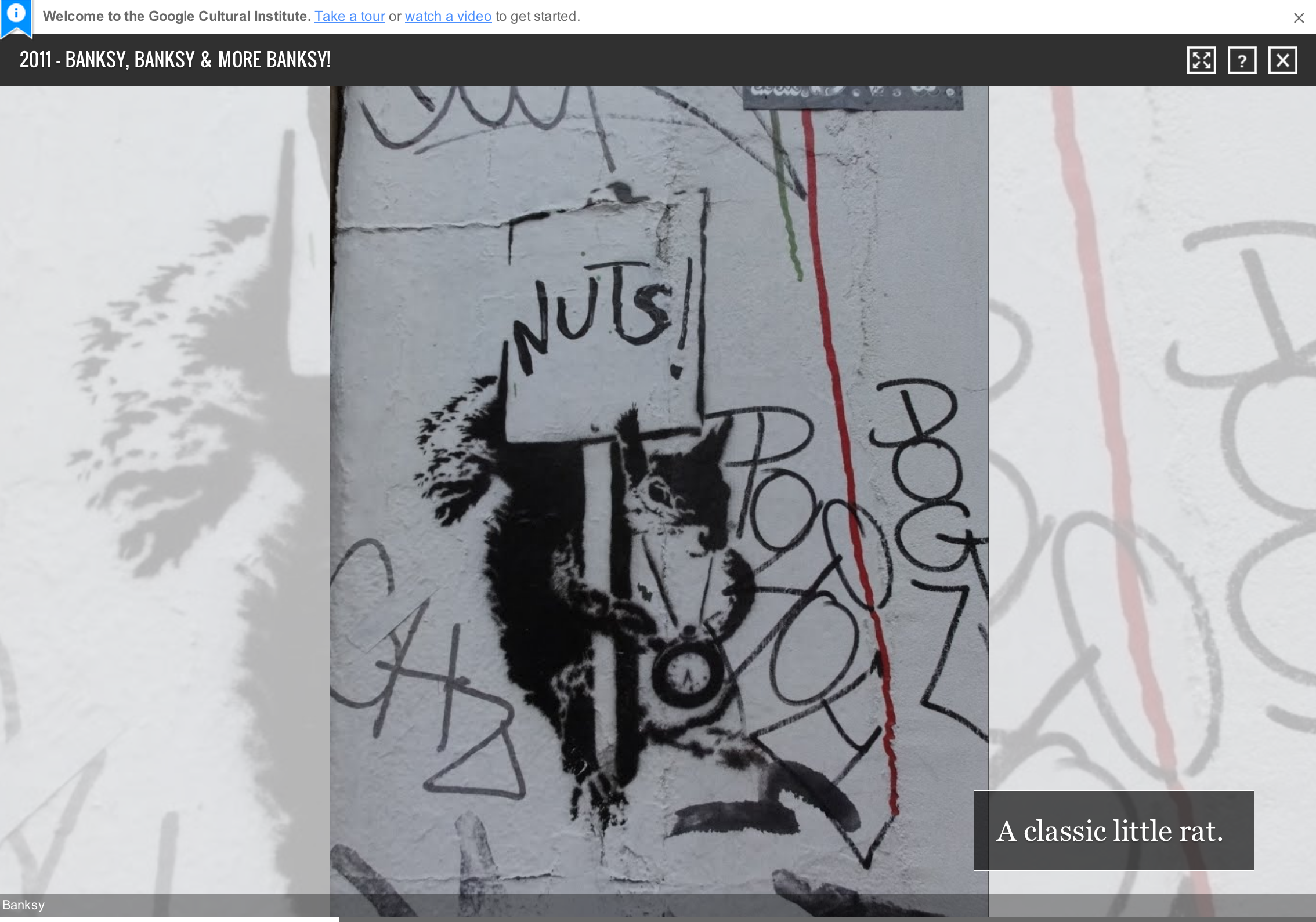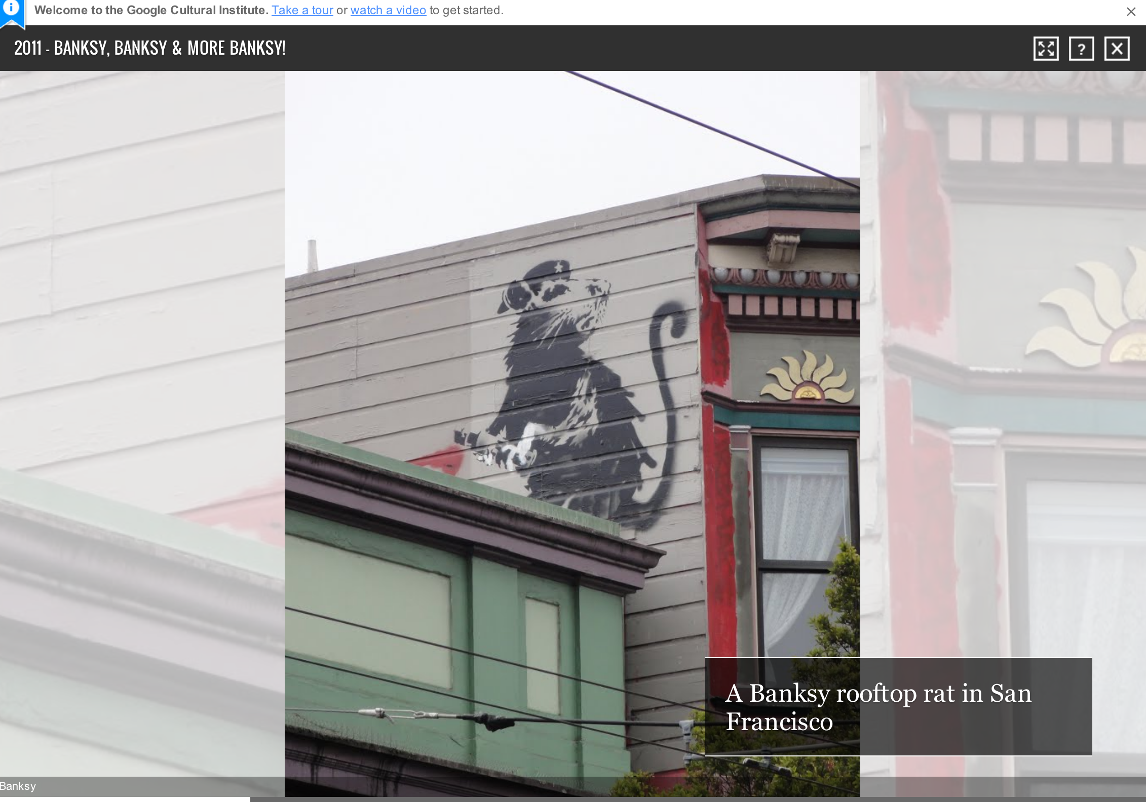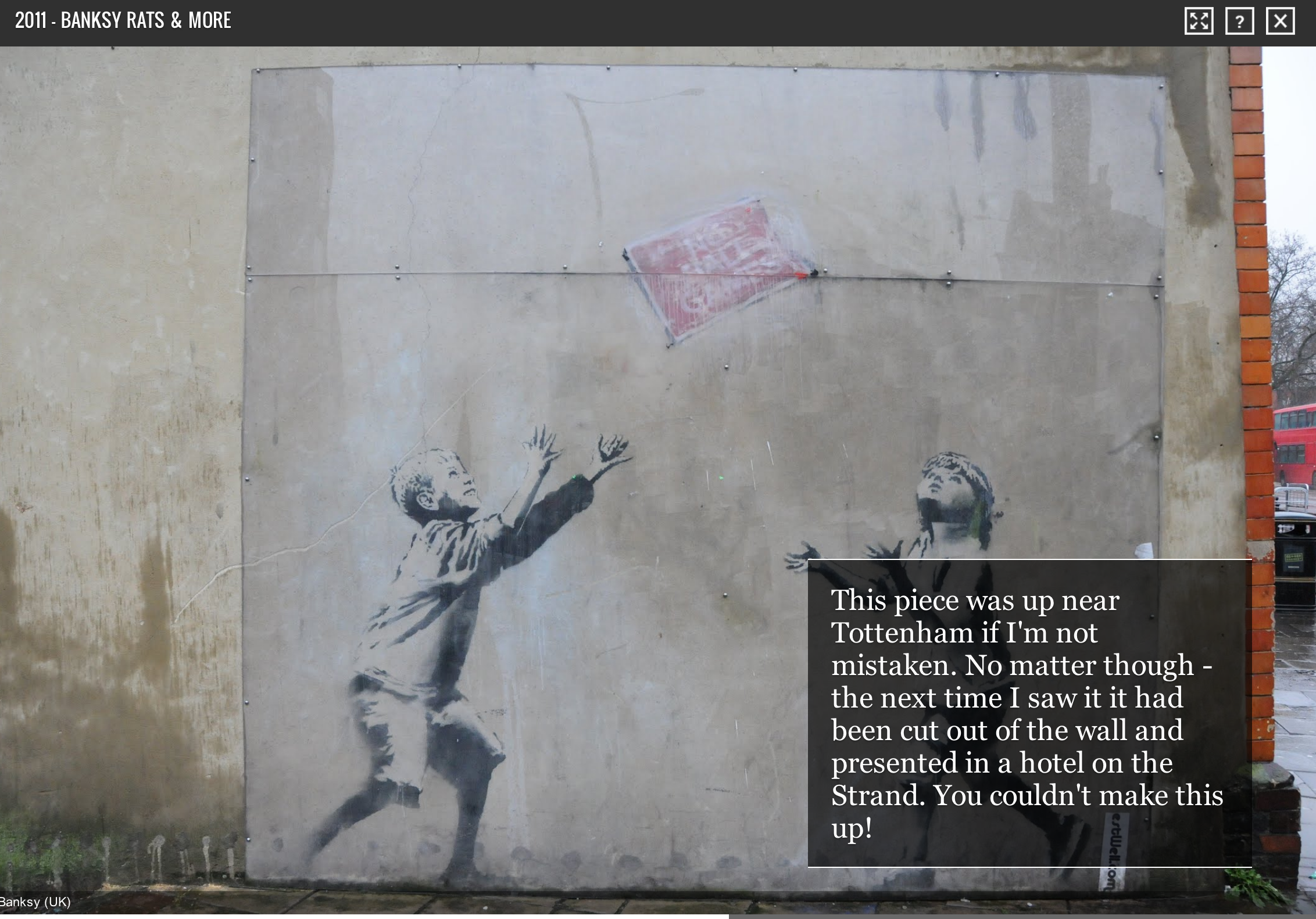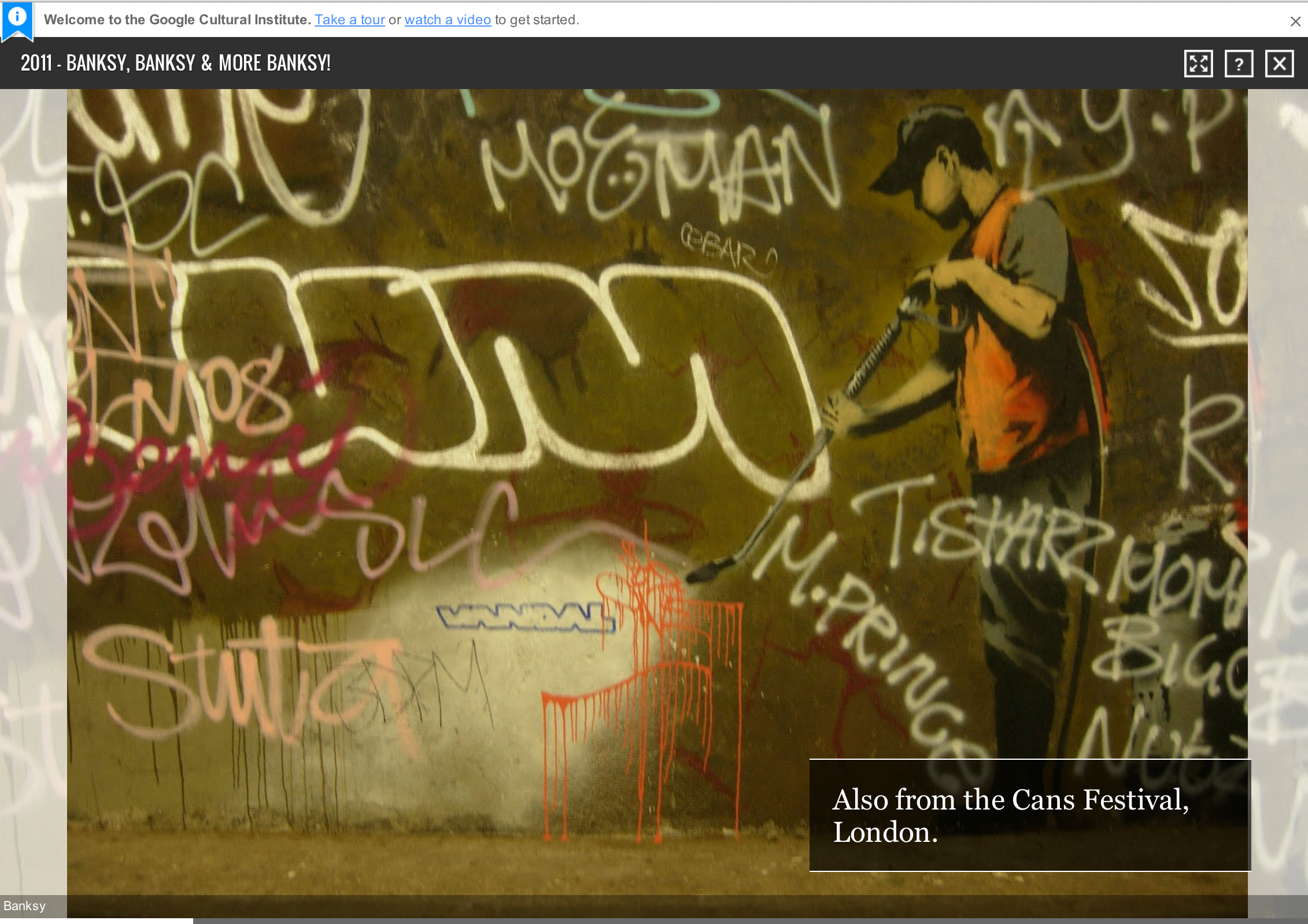 In the Street Art Project you might search for Banksy. You'll find not only hotspots for Banksy work, but Exhibits too, and a topic that links you to all works by the artist. This Street Art project appears – at first – to be an all-encompassing Graffiti collection project that only Google could serve up at such a scale.