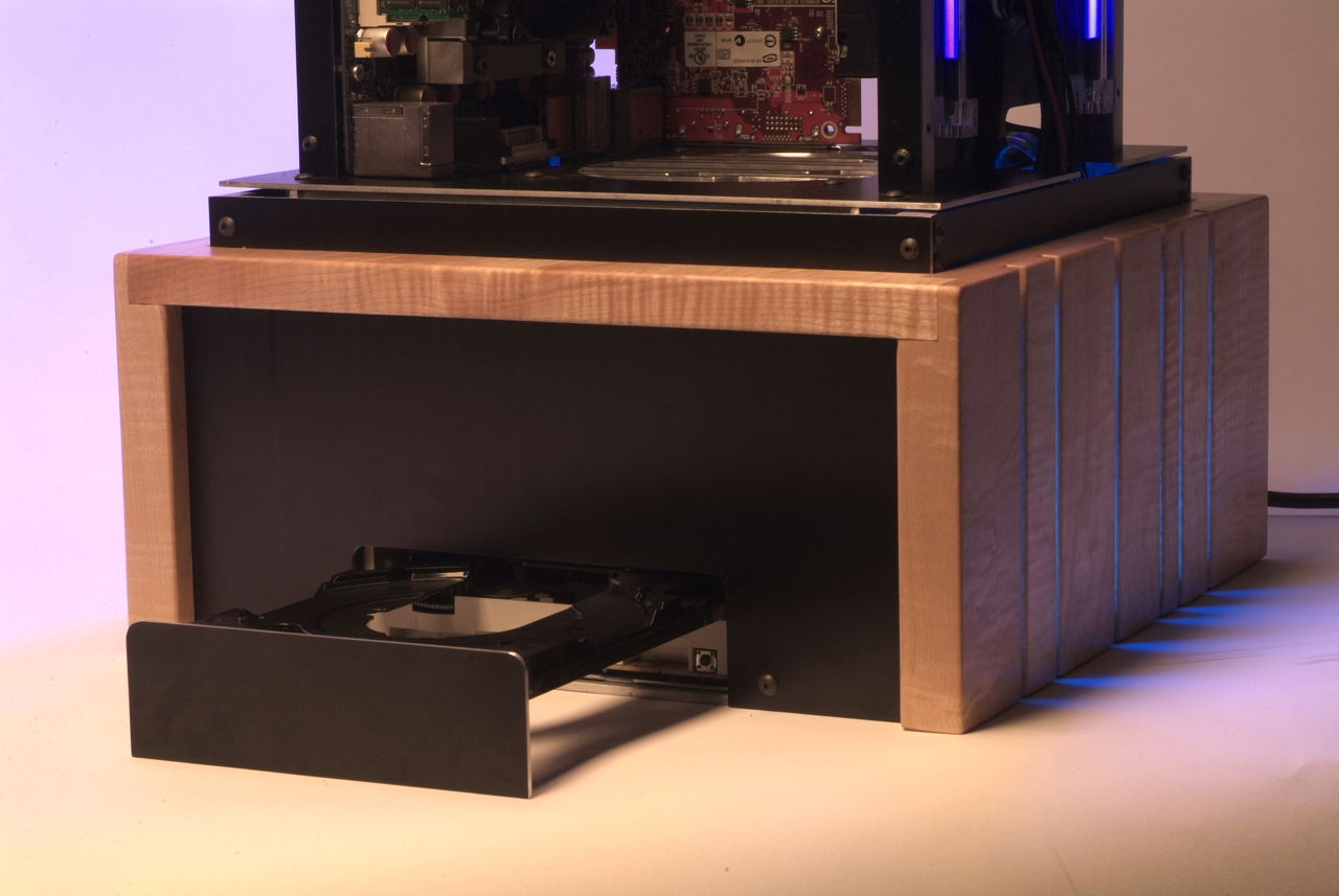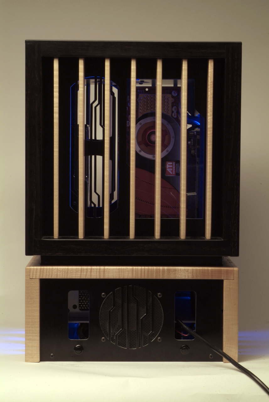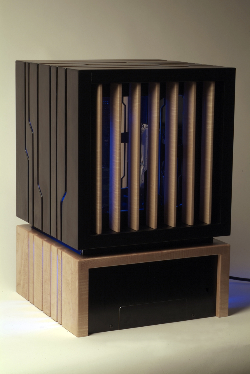 Wood seems to be growing in popularity as a PC case mod material, and it's certainly shown off to its best advantage in the shape of Nick Falzone's Chiaroscuro. Made from ebony and maple, this is less of a case mod and more of a ground-up new build; inspired by the renderings of the Beijing Digital building, it's a beautiful sandwich of wood, black brushed aluminum and UV acrylic.