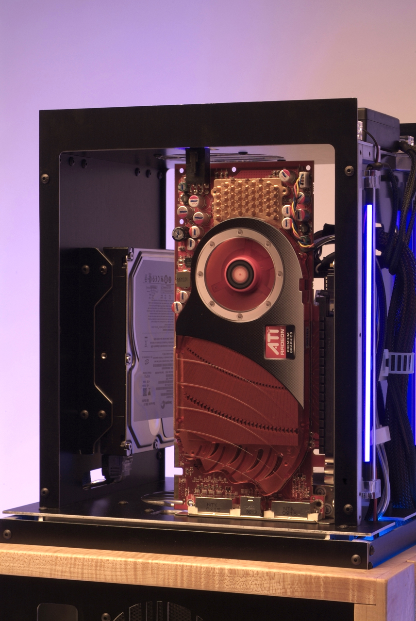 The case has two sections: inside the upper, primarily ebony part is a J&W Mini-ITX motherboard, AMD Radeon HD 4850 graphics card, AMD Phenom X4 9350e processor, OCZ So-DIMM DDR2 RAM and Seagate Barracuda 7200.11 1TB hard drive. The lower, meanwhile, hides the power supply and DVD drive. Each side of the top cube is 30cm, making the end product on the large side for something Mini-ITX based.