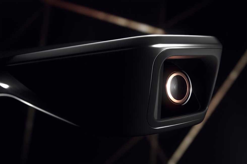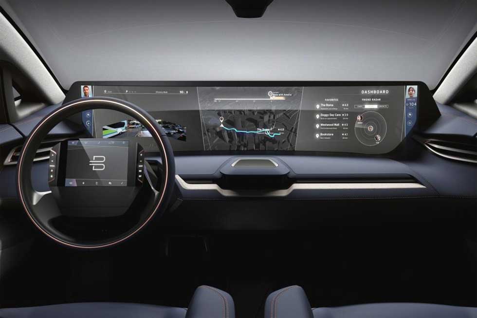 One of the images shows what appears to be a camera for the autonomous capability. Inside the car has a gigantic display that runs the entire length of the dash. The car promises 5G connectivity for mobile internet and has facial recognition and can recognize voice and hand gestures.