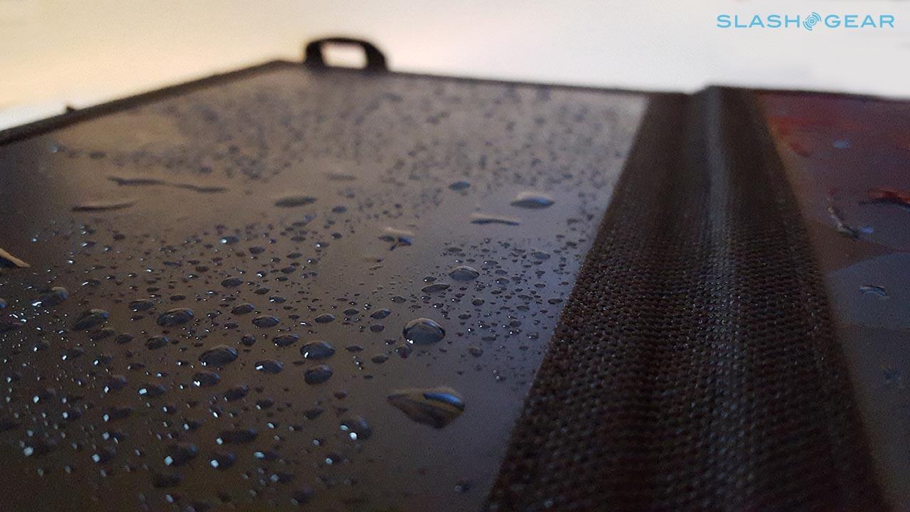 As far as actual design goes, the Choetech 19W solar charger is great — it feels and resembles a fabric folder when folded up, is very lightweight at about a pound in weight, can be nestled into most bags and backpacks without taking up much room. As well, the construction is water-resistant, and while you can't submerge it into a pool of water, it does seem to handle water splashes and sprinkles without issue. I forgot the charger on a table one day, it rained, and the charger is no worse for it.