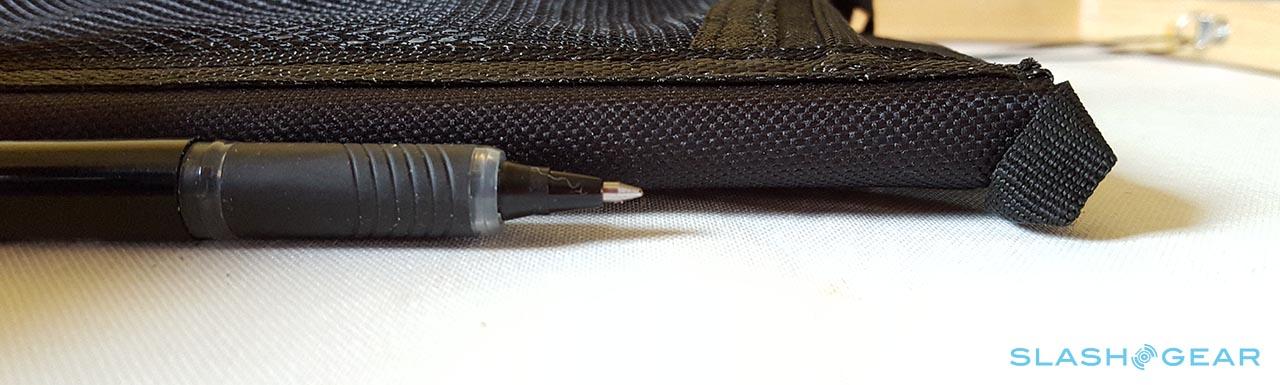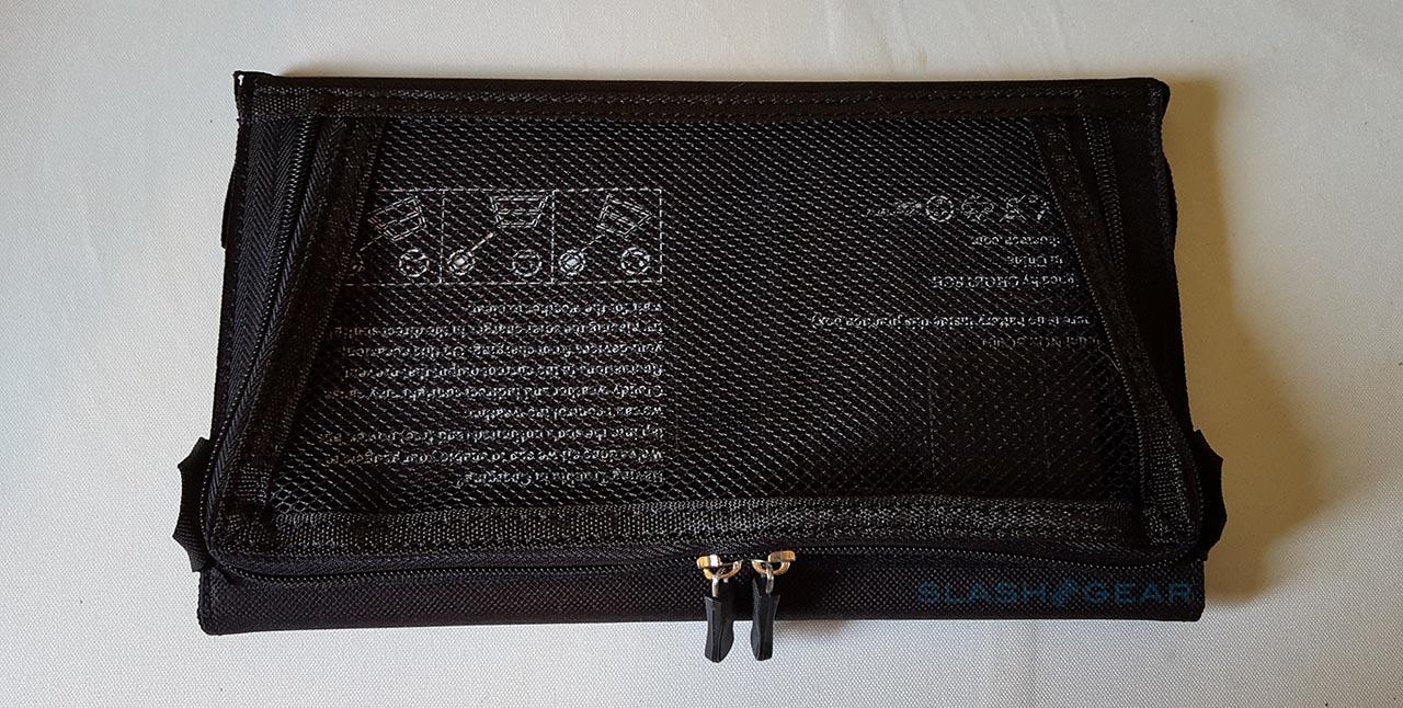 If you're on the go (or just worried about your gadgets being in the sun), there's a zipped mesh pocket on the rear in which you can nestle your items. The two charging ports are also located in this pocket, as well as a single elastic band to hold, for example, your phone. The pocket is large enough for two handheld gadgets — shown below are a BlackBerry Q10 and a T-Mobile mobile hotspot.