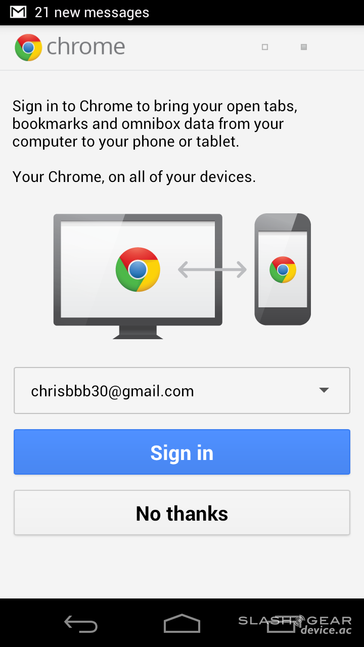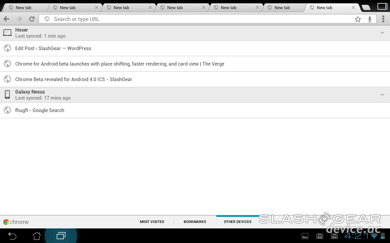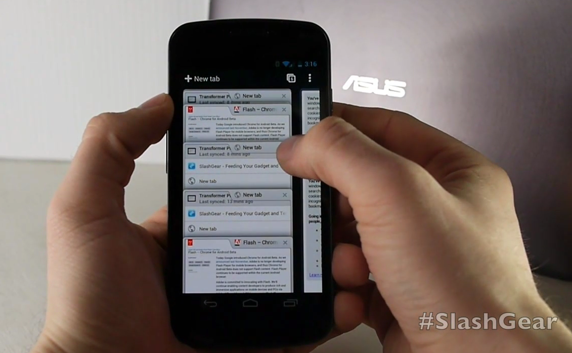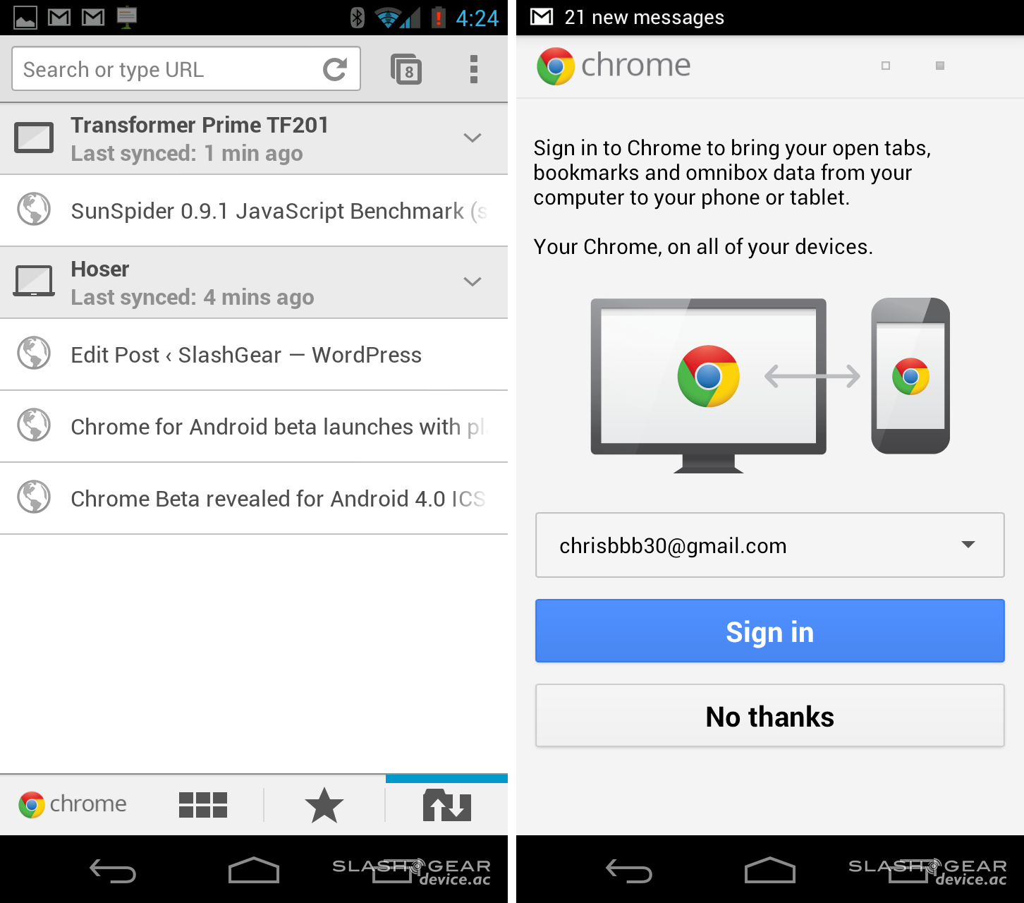 The video you're about to see shows both the Samsung Galaxy Nexus and the ASUS Transformer Prime, each of them running Android 4.x Ice Cream Sandwich, each of them running this first public release of Chrome Beta. You'll find the experiences to be very similar with slight changes in icons and text locations due to size of display, and the same ability to see other devices as well as pre-fetch data from webpages before they're needed. Notice though the slight differences – the ability to use the voice recognition engine on the tablet and the same option not appearing on the phone.