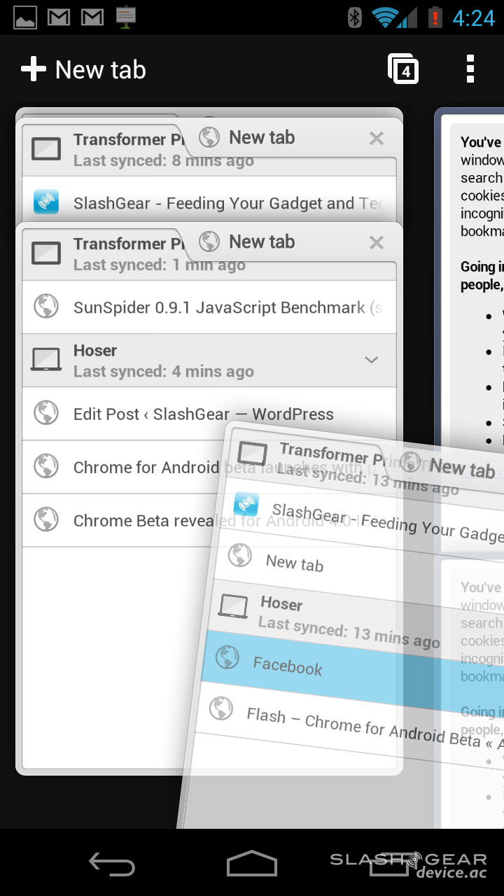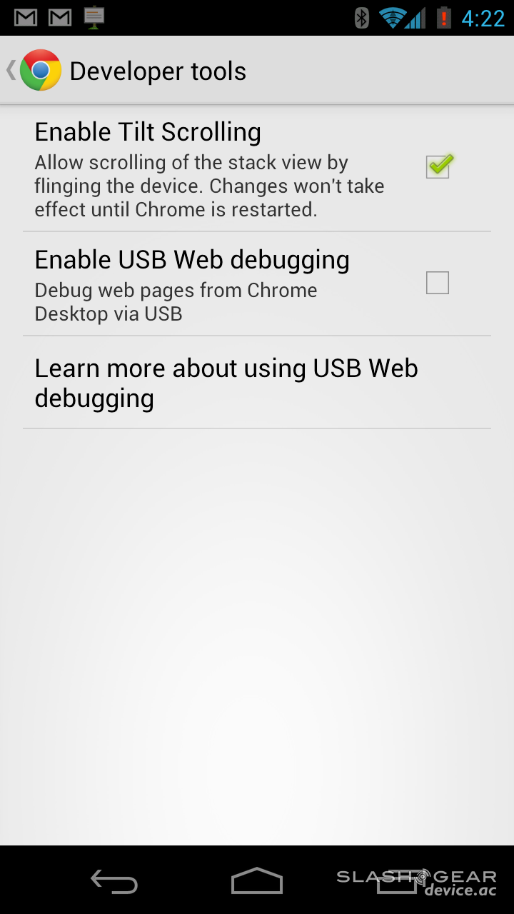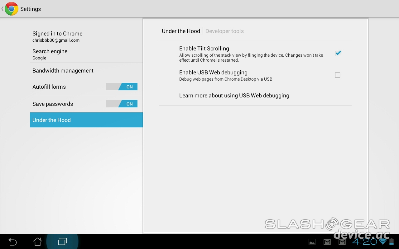 Another point of interest when comparing the two different sized versions here: Tilt Scrolling is an option for both, but there's no card tabs in the tablet-based Chrome like there is in the smartphone-based Chrome. You can still push your tabs back and forth in a similar manner above your browser window, but they don't slide exactly like the smartphone-based card tabs.
