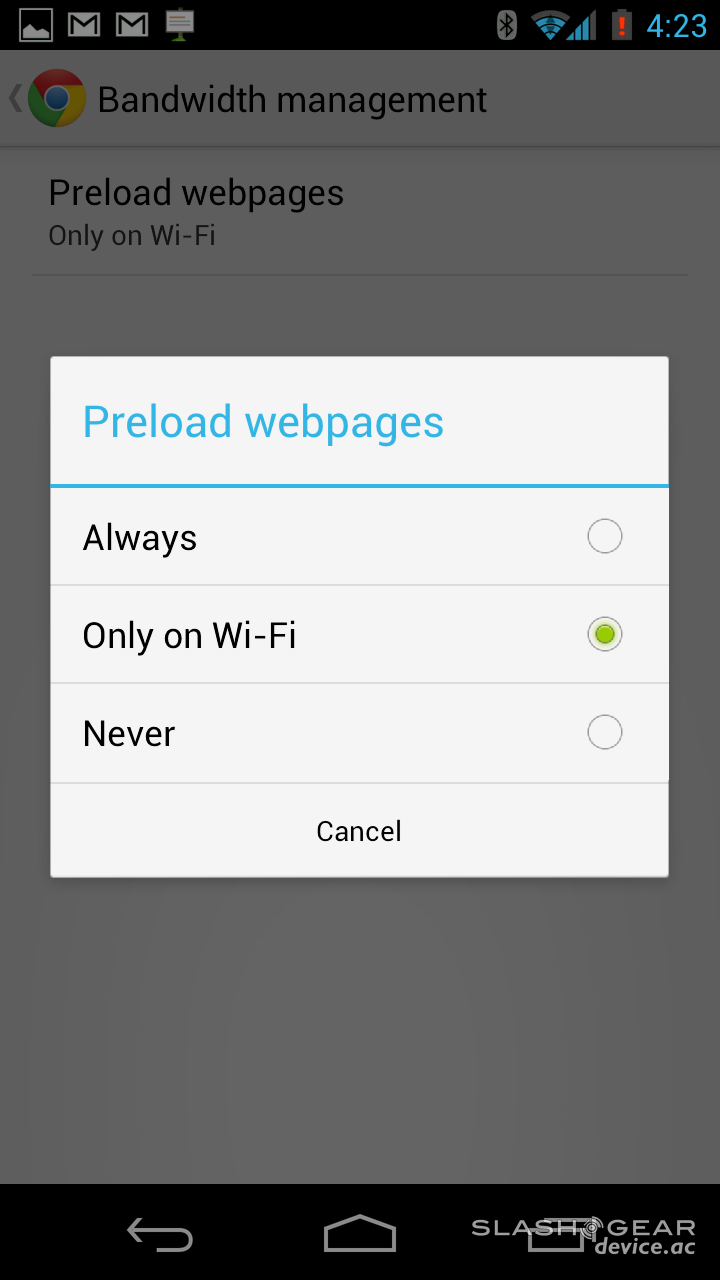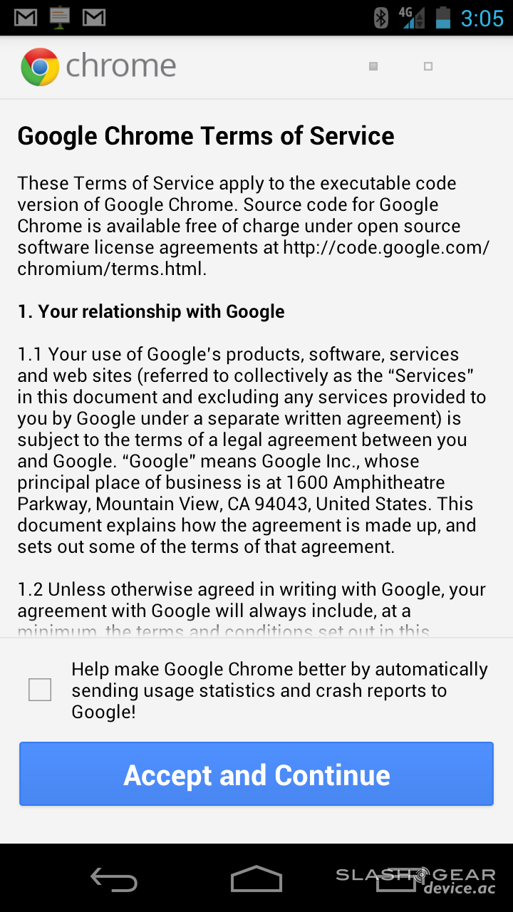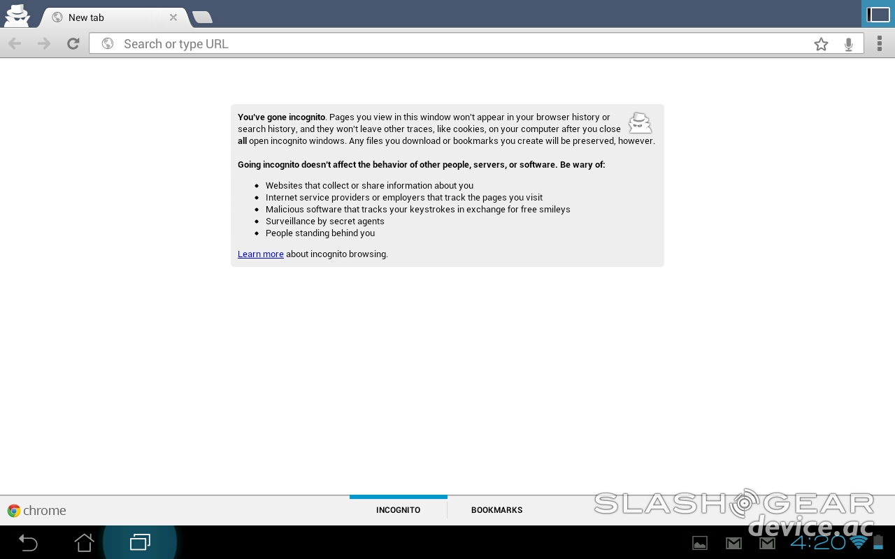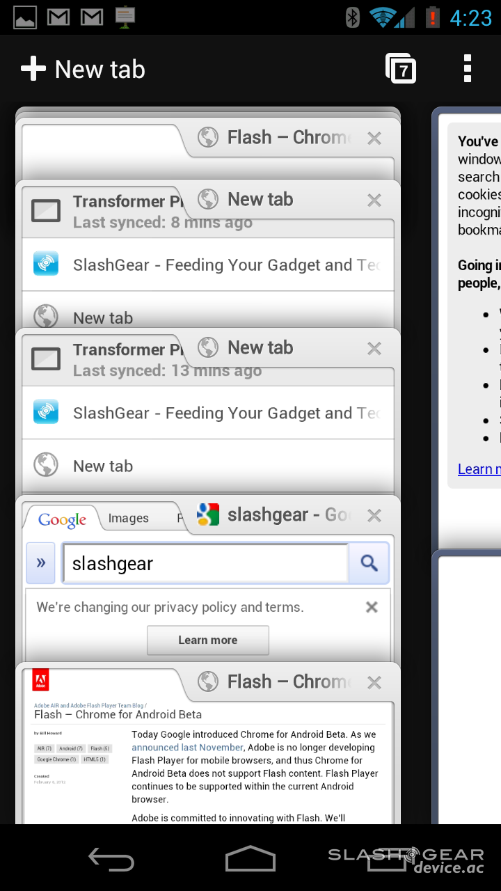 Another point of interest when comparing the two different sized versions here: Tilt Scrolling is an option for both, but there's no card tabs in the tablet-based Chrome like there is in the smartphone-based Chrome. You can still push your tabs back and forth in a similar manner above your browser window, but they don't slide exactly like the smartphone-based card tabs.