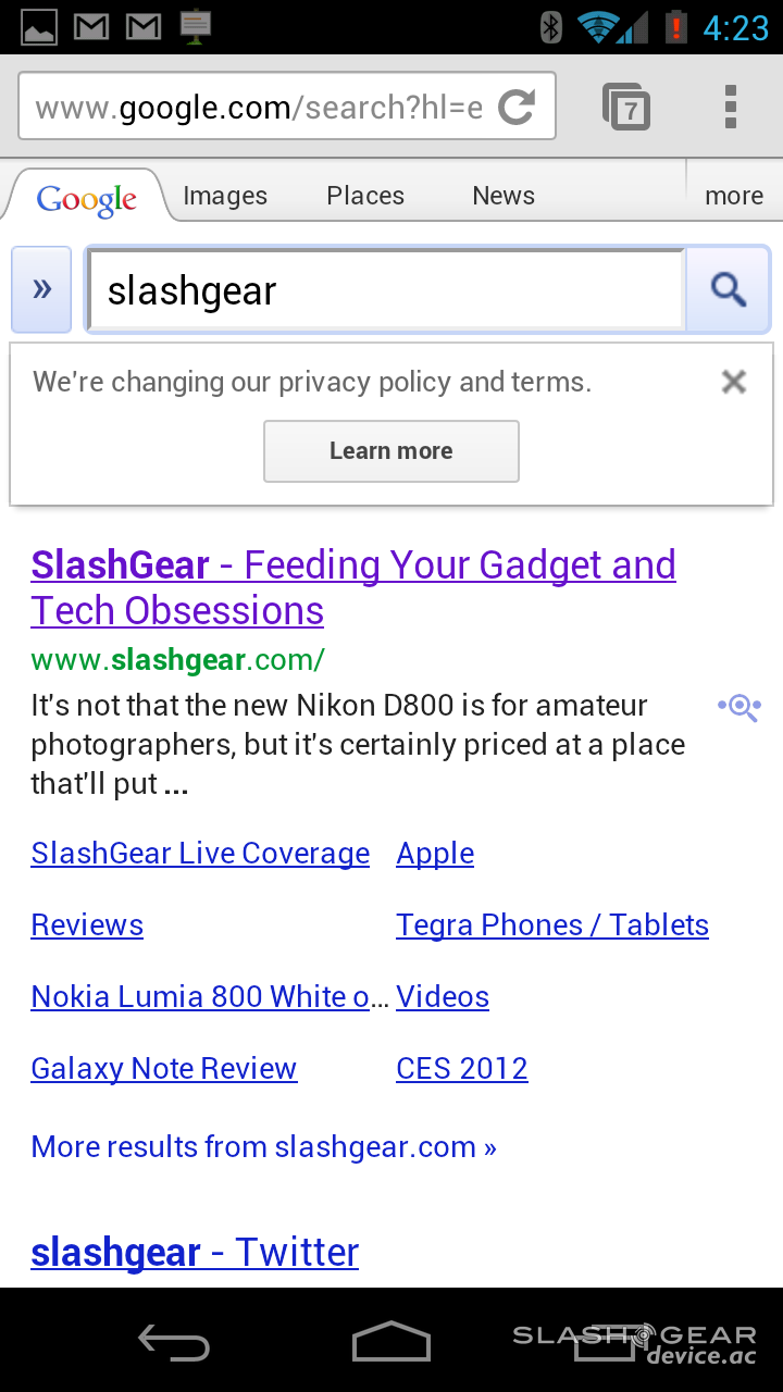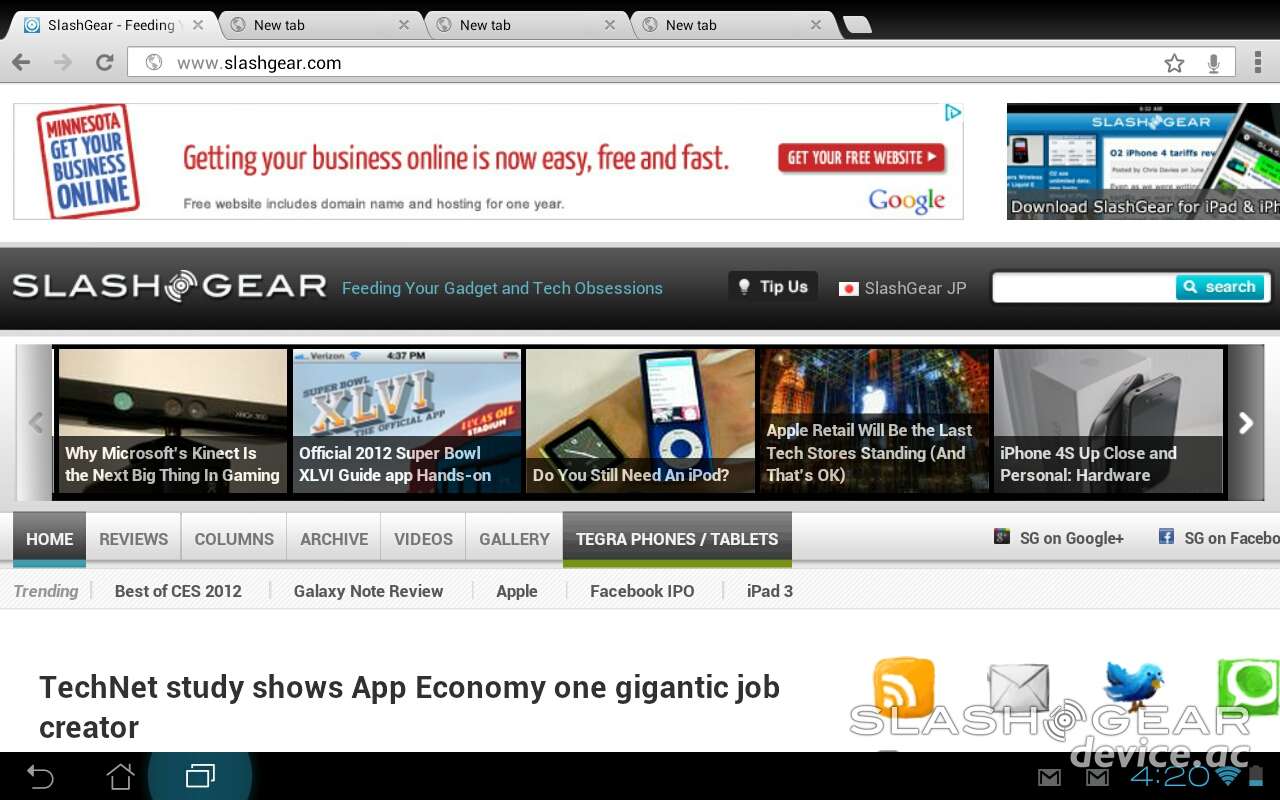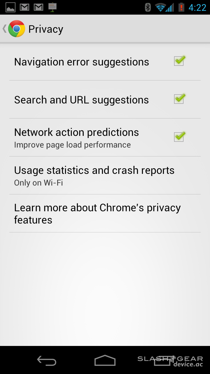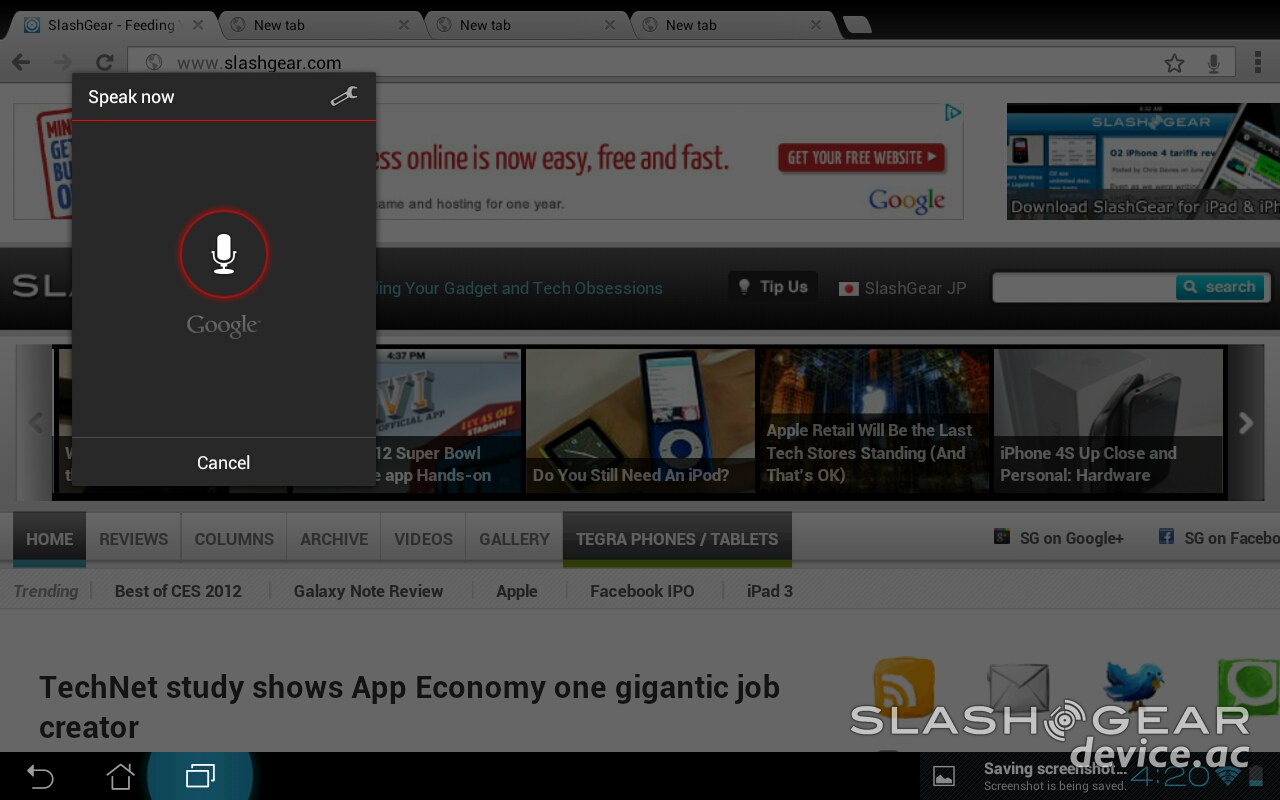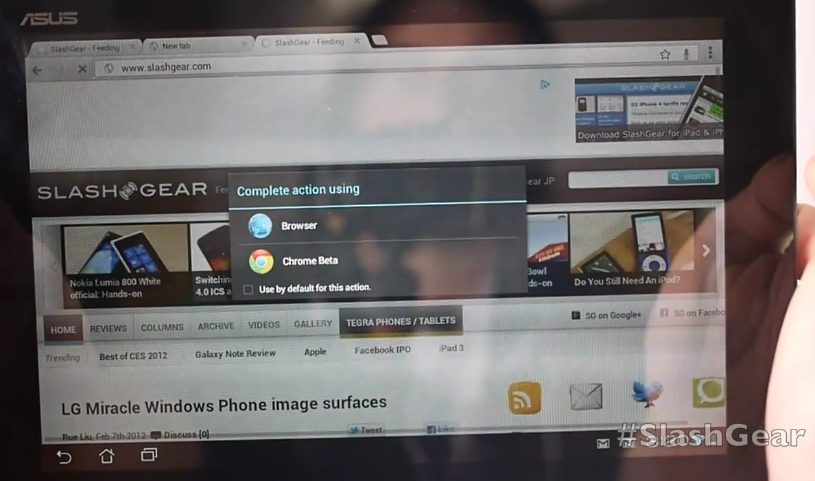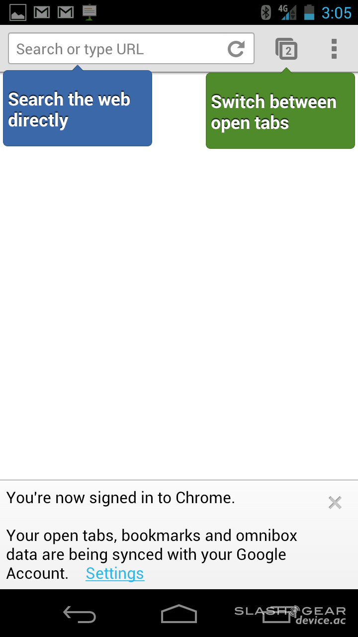 Link Previewing is a feature that Google speaks about in their trailer for the browser but we've not encountered a use for thus far. It's supposed to have links popping up in balloons, essentially, when they'd otherwise be hard to tap. Using these previews has been so off-and-on for us that we'll wait to show it off in any real manner. Signing in works far better, it allowing you, again, to access the tabs you've been using on other machines with Chrome on the fly. Your Chrome iterations also learn from one another for smart URL completion, but watch out if you're using your Transformer Prime and expect to be able to select one of these pre-typed selections with your arrow keys – that's not yet integrated.