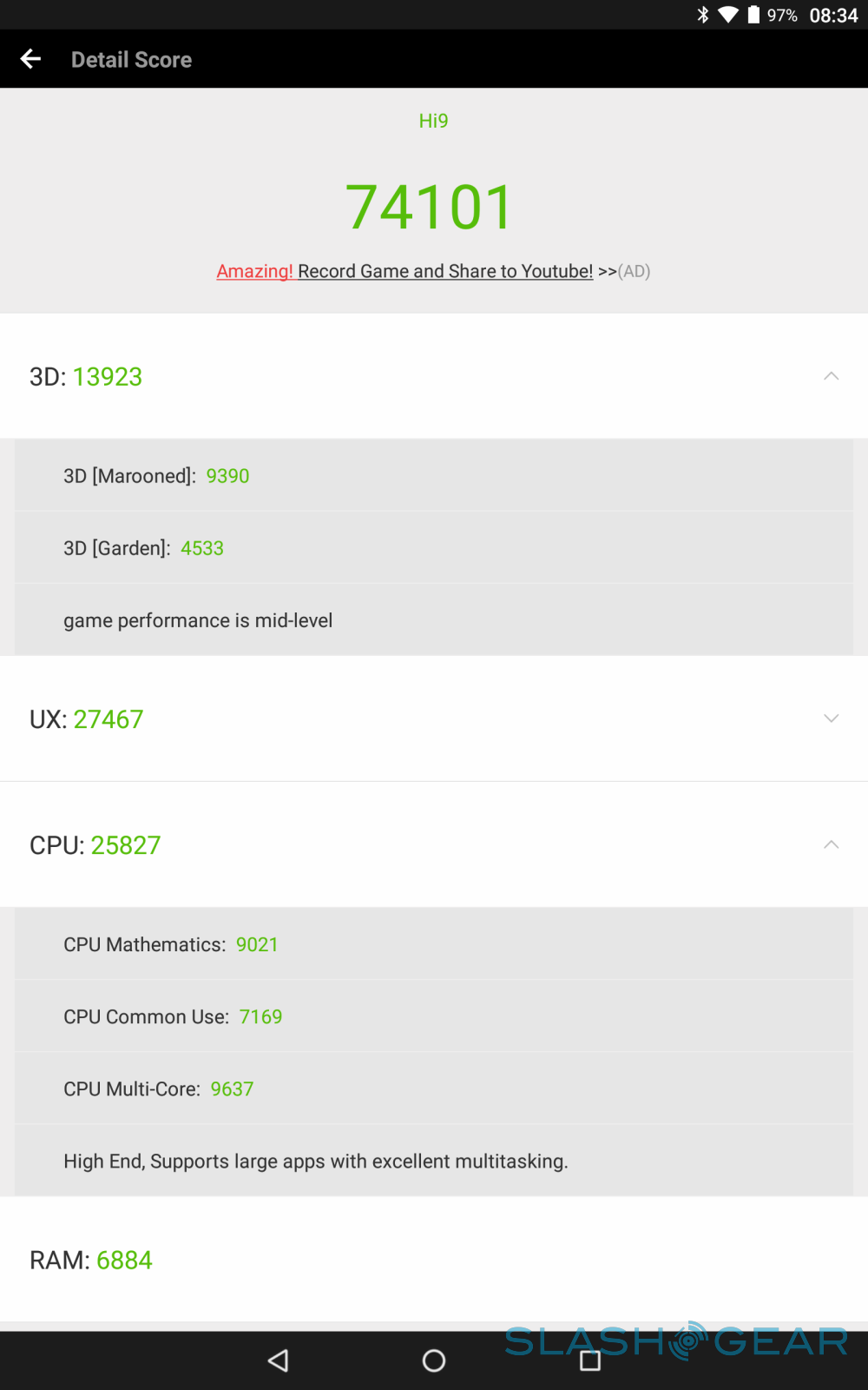 Therein actually lies yet another caveat to the Hi9's gaming chops. Actually for any Android tablet for that matter. Most Android games presume a screen size no bigger than a phone, and you might find yourself uncomfortably reaching for the middle of the screen with your thumb for games that require you to touch or swipe near the middle of the display.