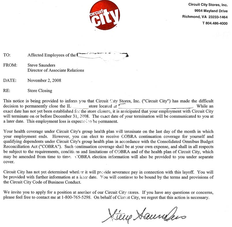 Affected employees have been sent a letter (see the gallery below) informing them that their jobs will terminate on or before December 31st; Circuit City "has not yet determined" if they'll be eligible for severance pay, but they've made clear that transfers between stores are not possible. In fact, those being made redundant must wait until that process is fully completed before they can apply to work at an alternative store.