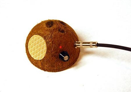 I don't know how he did it, but he did. He put an small amplifier, jack, power on LED, and volume knob in a coconut.