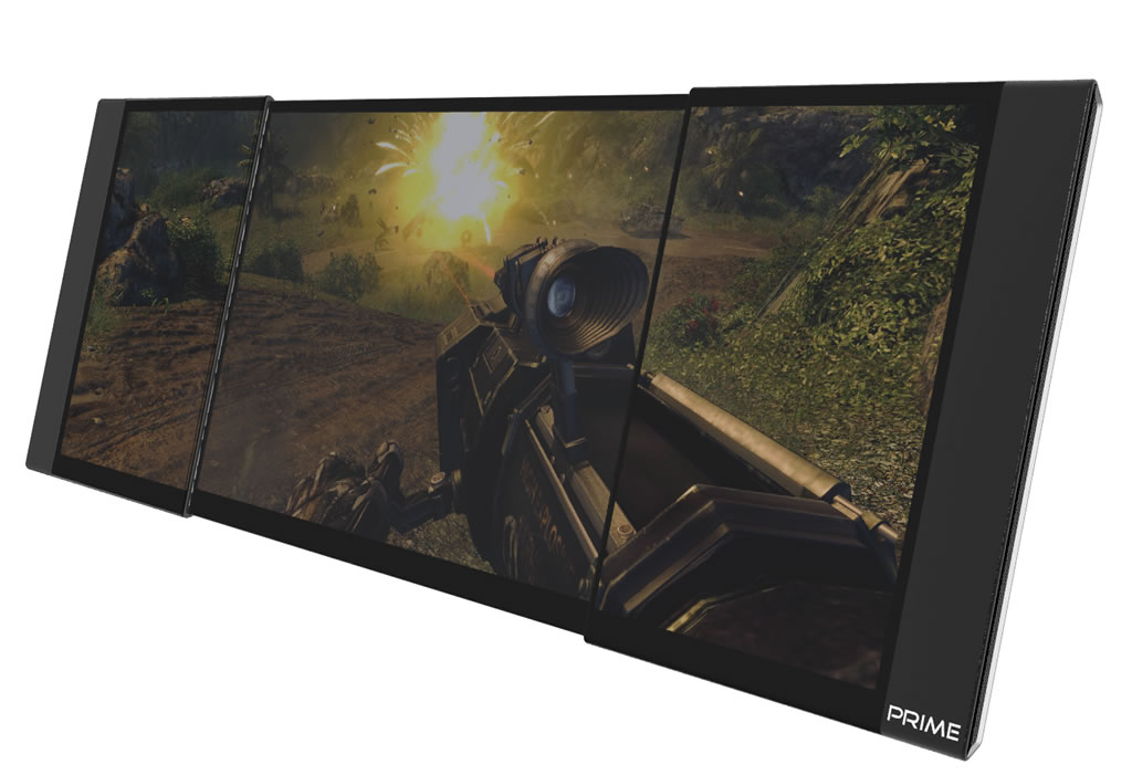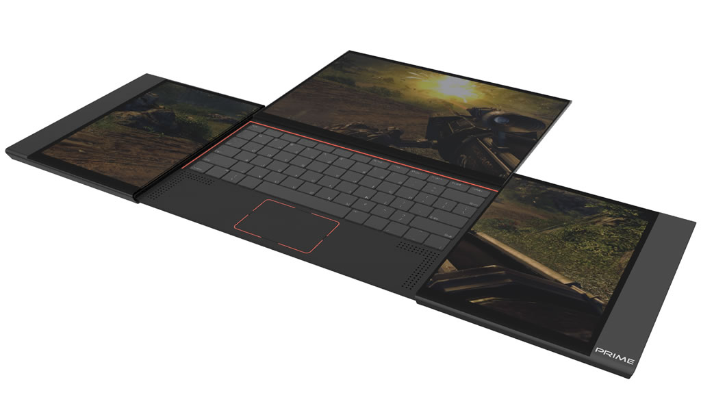 The Prime Gaming Laptop main screen is an OLED 10-inch in size with 16:10 aspect ratio. It features a pair of Aux OLED wing-panels with 8:10 aspect; offers a super wide, 32:10 aspect ratio, 26-inch screen viewing estate when opens and is fully collapsible, laying completely flat on the ground.