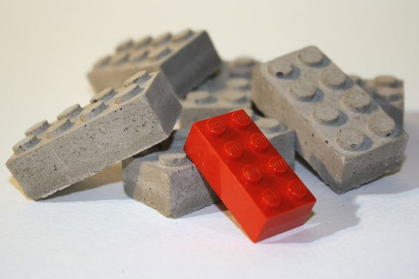 The concrete blocks are designed to look just like the 2 x 4 LEGO bricks you played with as a kid and might still play with today. Each brick measures 1 5/8" x 3/4" x 1/2". The seller of the Concrete Building Blocks also notes that the bricks vary in color and texture. It appears some of them might be missing corners too.