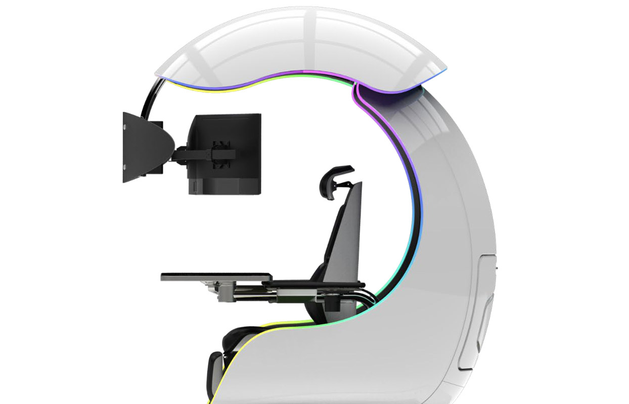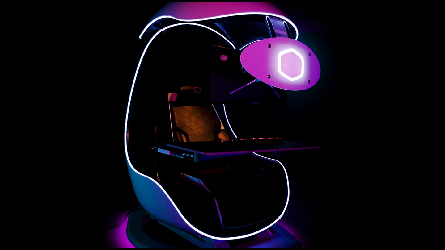 The Cooler Master Orb X GamePod is a "fully immersive multi-purpose semi-enclosed workstation" intended for both gamers and professional computer users. This piece of hardware has an egg-like shape with a chair at the center, multi-colored light strips on its edges, and the ability to support up to three 27-inch monitors inside. This workstation was designed with "full immersion in mind"