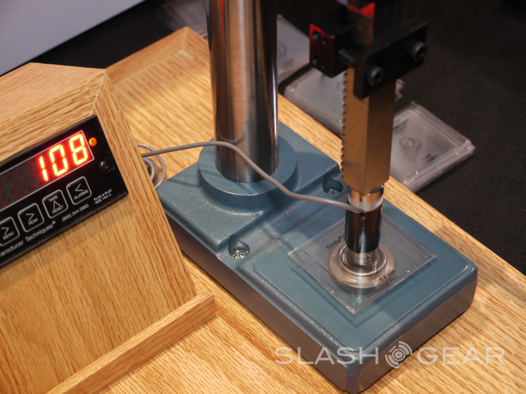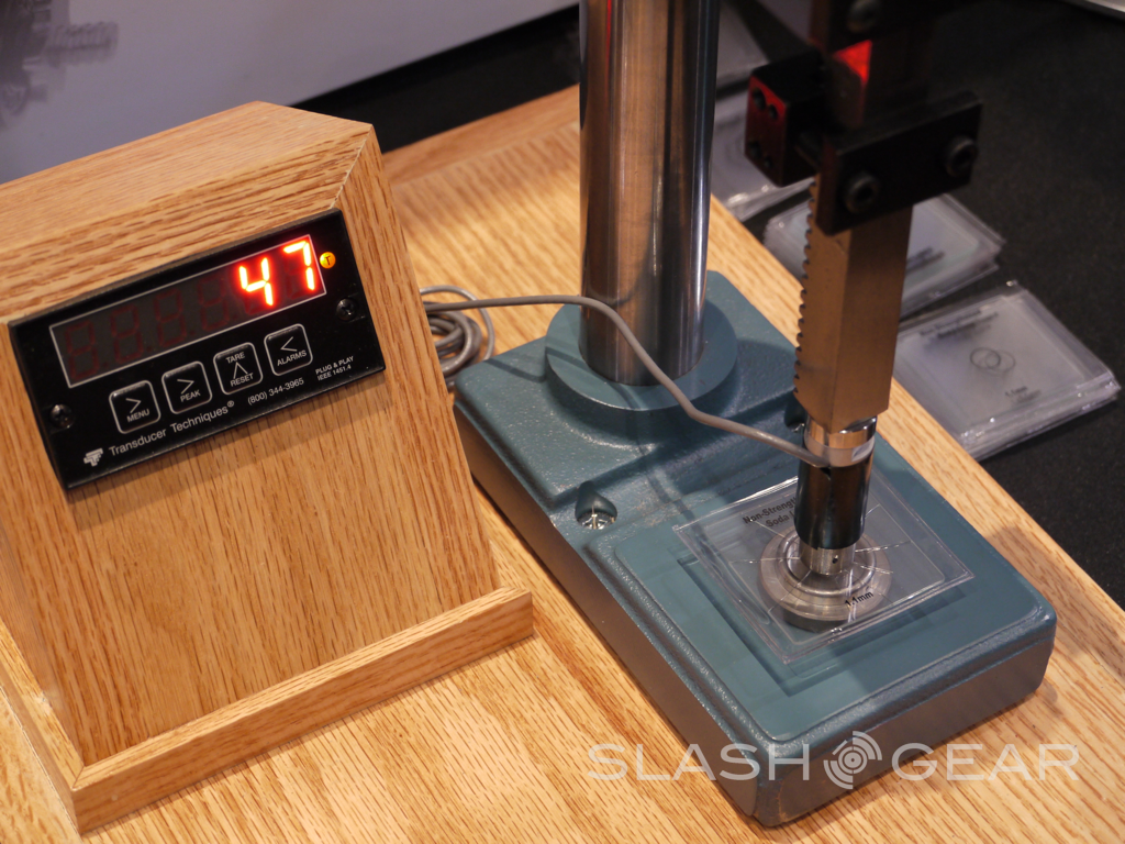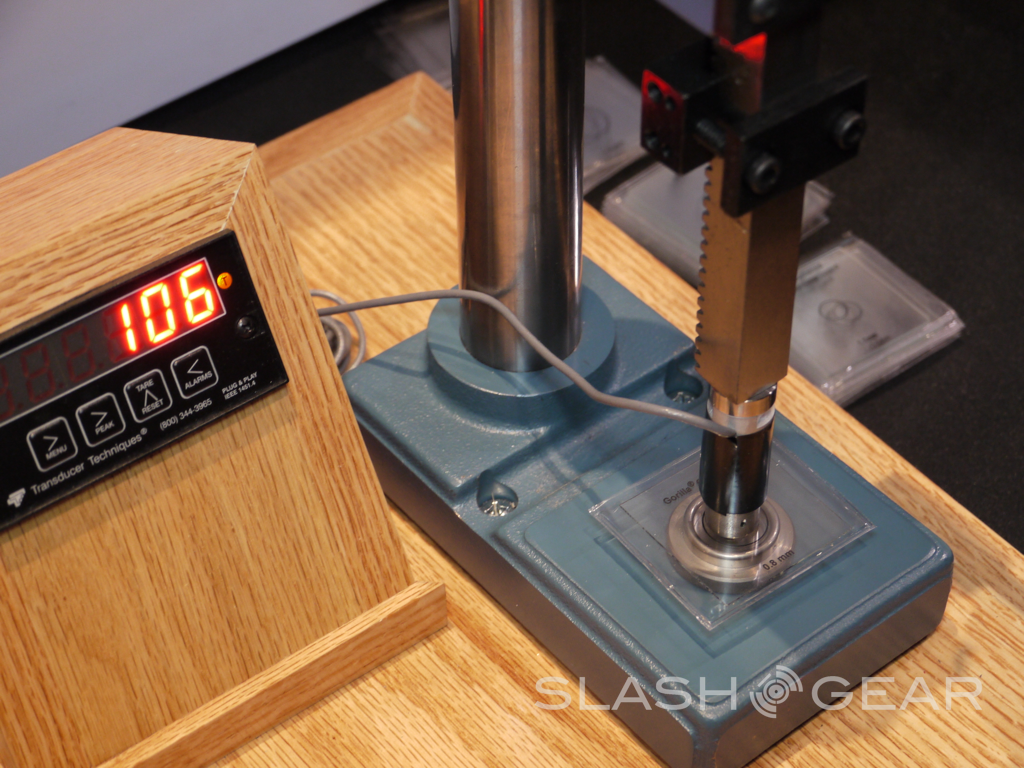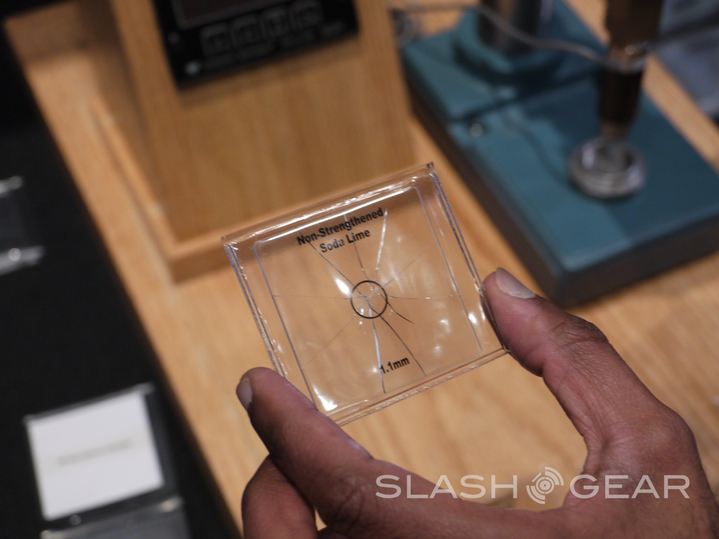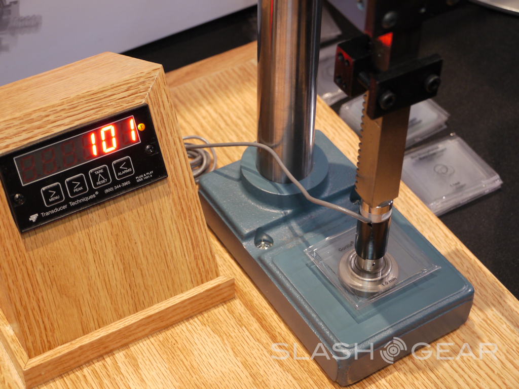 Tonight at the CES Pepcom event we gave it a try and even pushed our hardest but it just wouldn't give. The new and improved Gorilla Glass 2 has more than a few improvements. According to our tests, and Corning, their new formula and fortified glass is around 20% stronger and 20% thinner. This will bring us thinner and smaller devices from tablets, smartphones, and everything else in between. They didn't mention scratch tests, or show them — but I was told the compacted process should help preserve those precious screens even better than before.