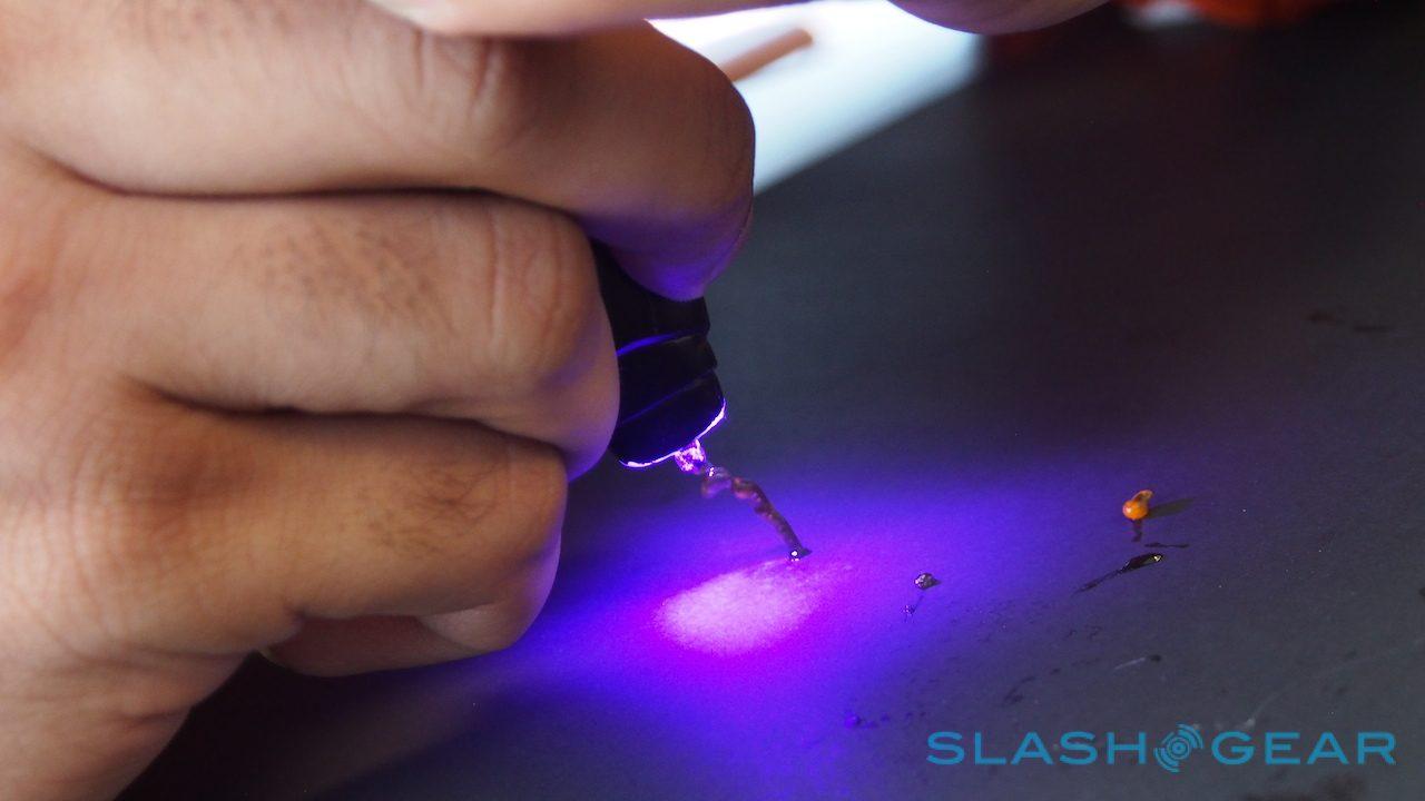CreoPop has a fundamental difference, however, from those other extruding styli. Whereas other such gadgets have used traditional 3D printing filament, heated up until it melts, CreoPop's pen runs entirely cool, relying instead on ultraviolet light to set the special "inks" used.