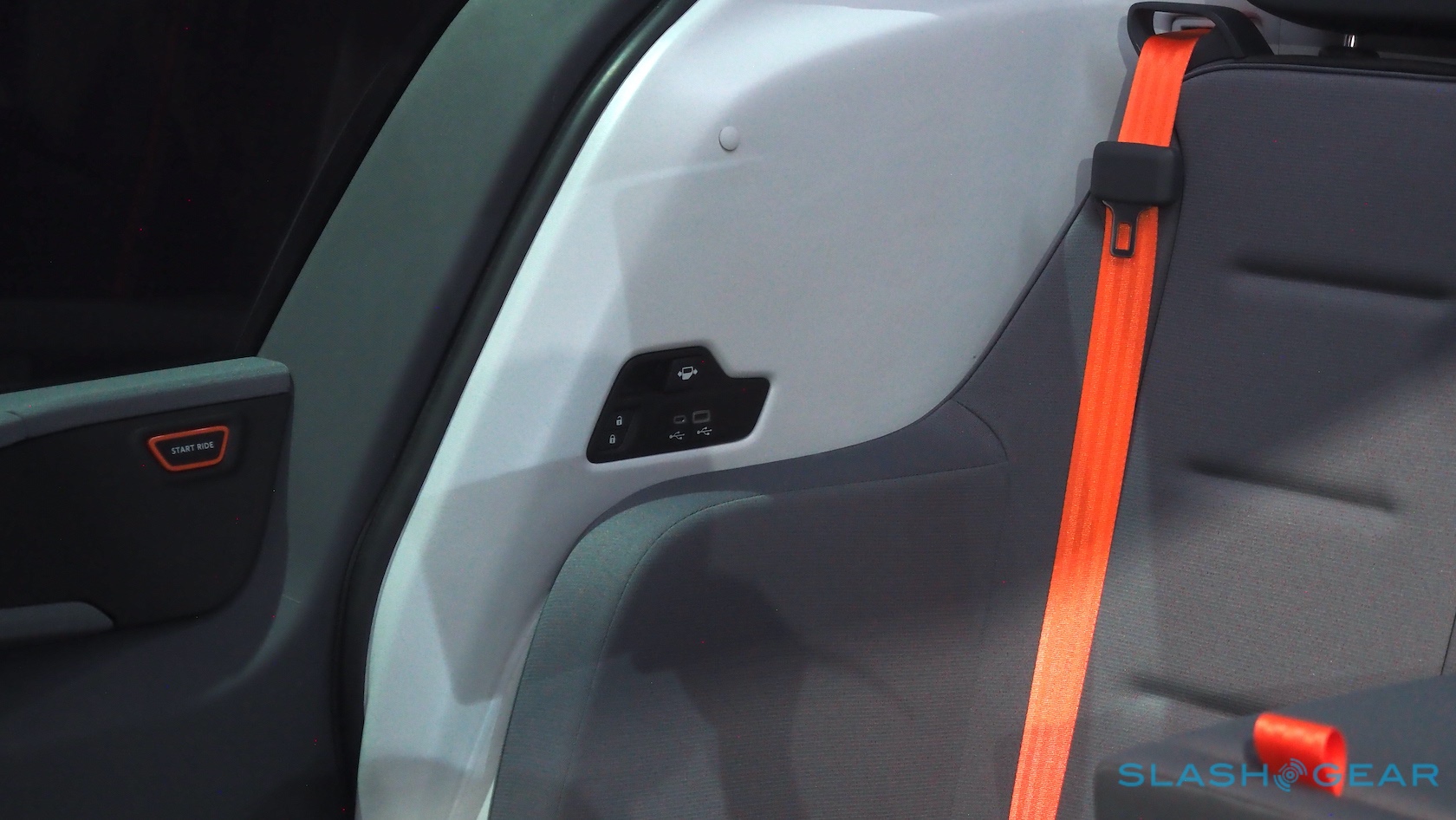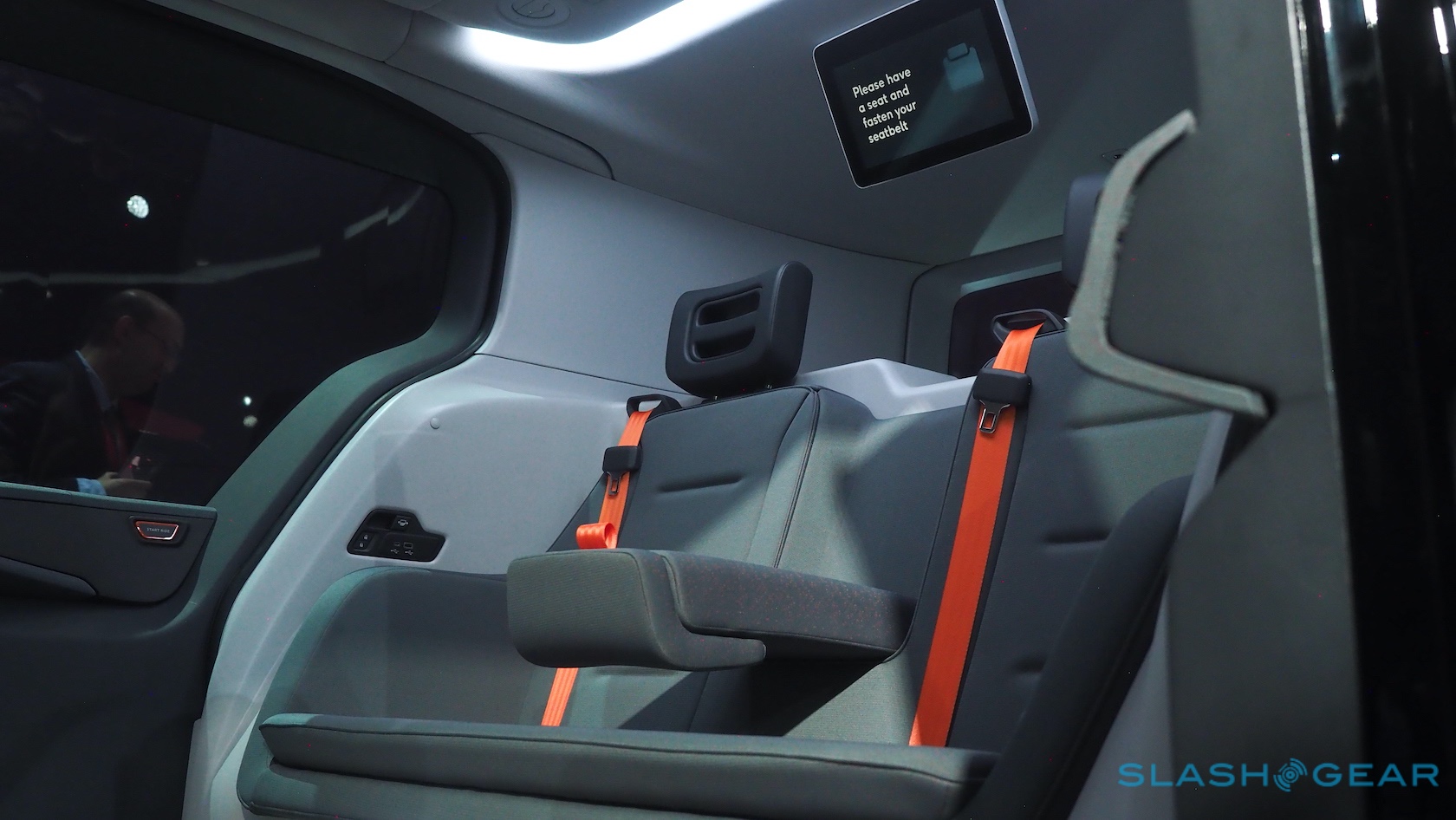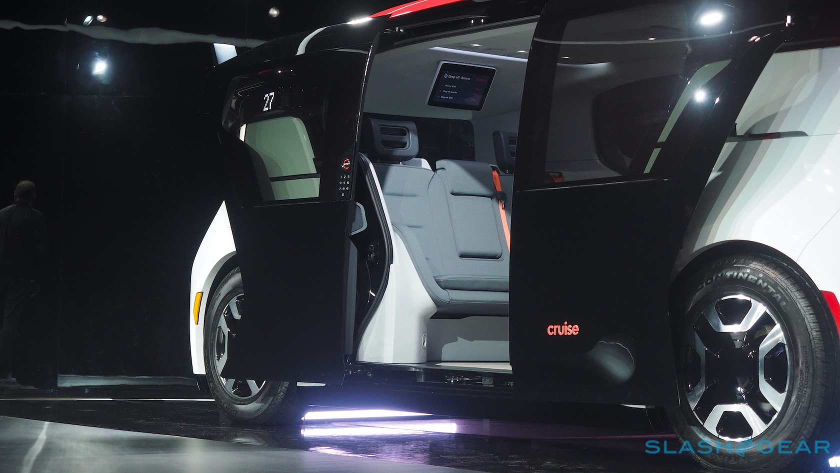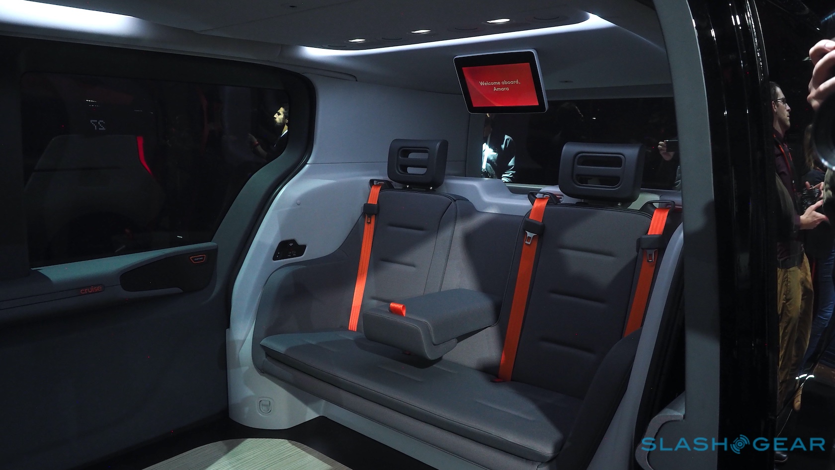 Each seat gets a bank of ports to charge their phone or other devices; two displays hanging from the roof show status messages, give you a schedule of pick-ups and drop-offs, and remind you to buckle up. Cruise opted for sliding doors rather than hinged, not just because they look cool but because they won't swing out and inadvertently smack cyclists off their bikes.
