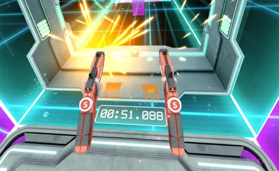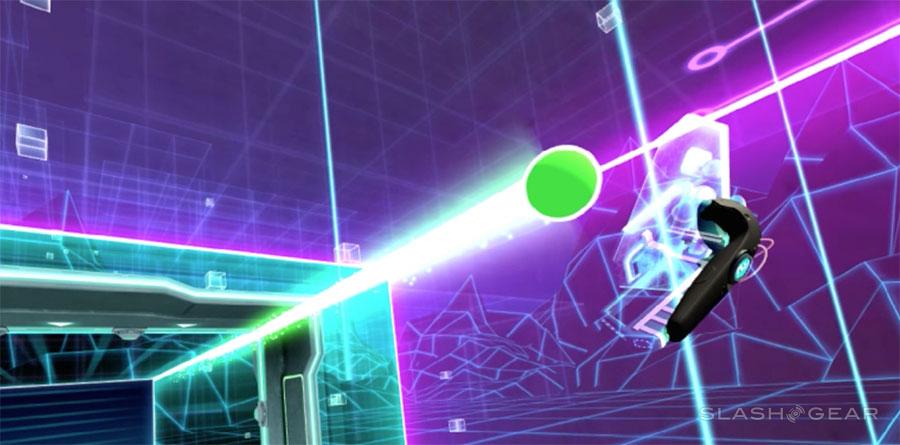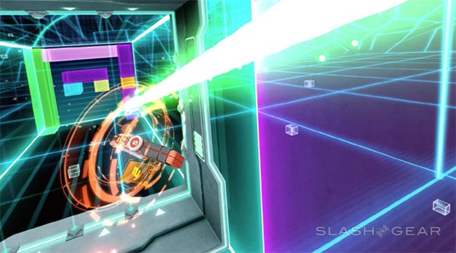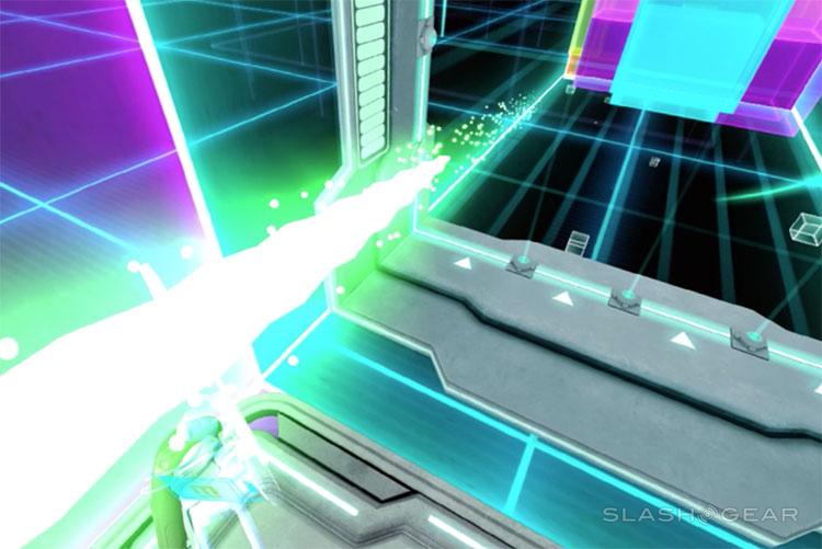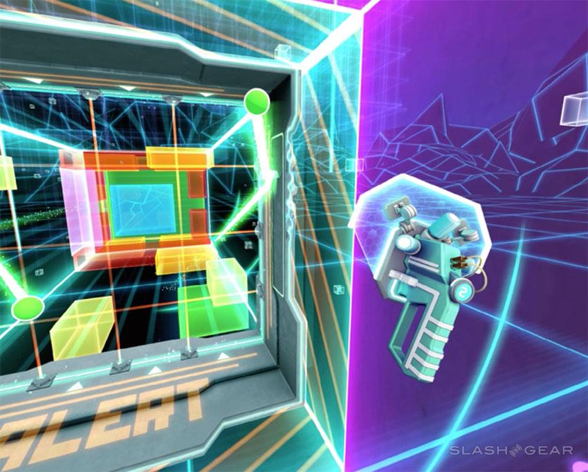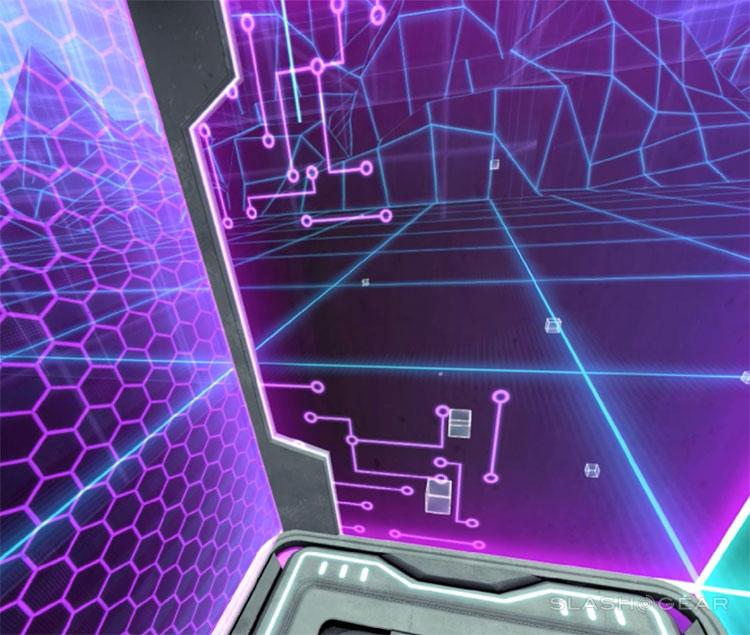 This game does not pretend to seem real. Let's get that out of the way immediately. Some games in VR seek to bring you to a place where you feel like you're literally standing in front of a dinosaur or on top of a real mountain. This is not that. This is more like TRON.