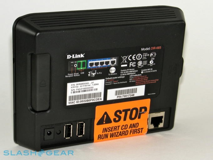 As well as the standard high-end home router connectivity – WiFi b/g/n, four gigabit Ethernet ports, WEP/WPA/WPA2 wireless security and a NAT firewall – there are also two USB 2.0 ports which can be used to add external hard-drives or printers and share them across the network. More unusually, there's a 2.5-inch hard-drive bay inside, which allows you to treat the DIR-685 as a basic NAS.