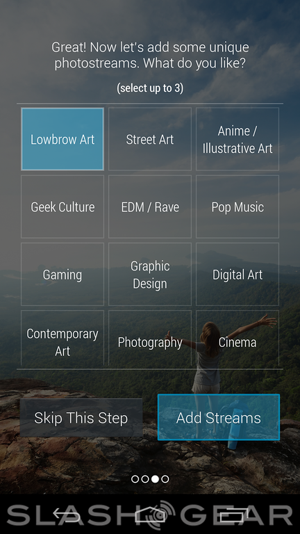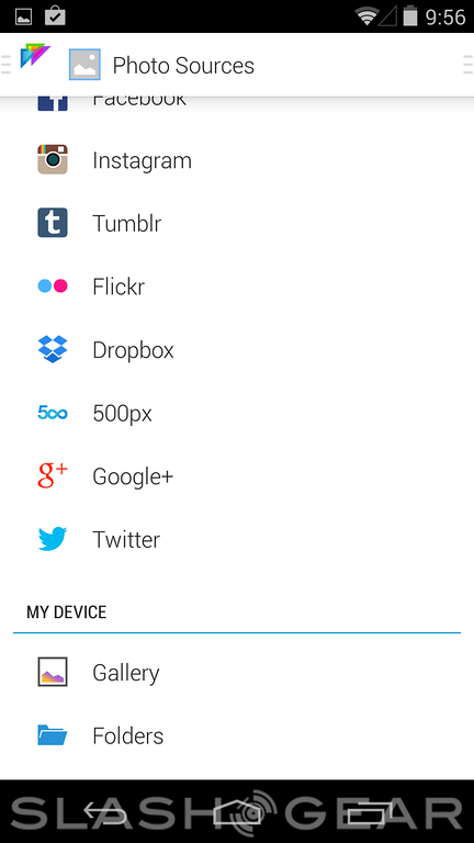 You'll find that you're also able to connect to Google+, Twitter, and your own photo folders on the device itself. In this way you're not even required to use the internet – this app can run completely internet-free. Once you've got a flow going, you'll be able to press the Play button and begin to see photos.