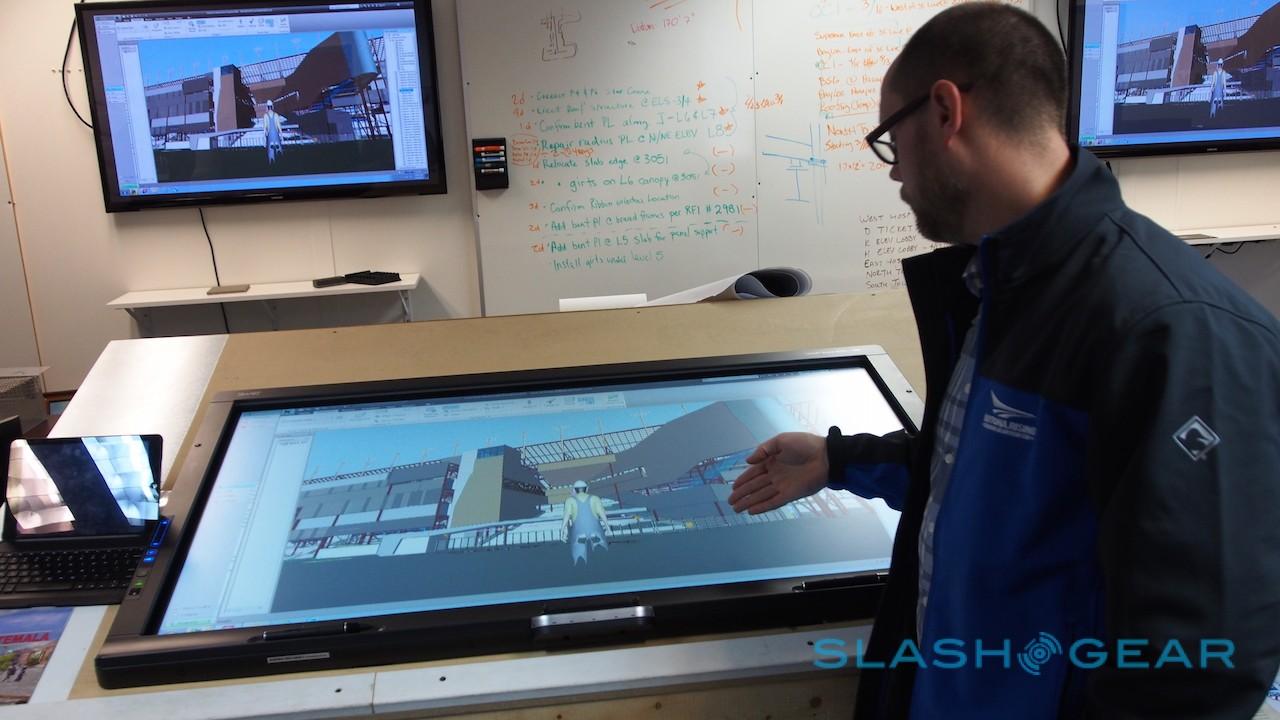 So, at the surprisingly spacious site office – known colloquially as the "Command Center" – the two firms and their subcontractors work from, roughly a half-mile from the track, gadgets have replaced the building industry's more typical tools. 60-inch LCDs dot the walls, each hooked up to an Apple TV for easy sharing of plans and more (PC users rely on AirParrot to link into AirPlay too), while there are more than 100 iPads on site giving access to all of the documentation along with real-time commenting. Superintendents create daily site reports by dictating with Siri and recording video, rather than more time-consuming text.
