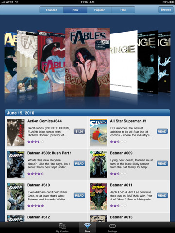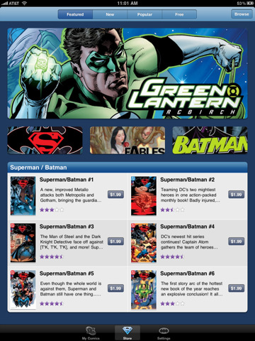 Marvel Comics no longer have the big-name iPad comic app space to themselves, with DC Comics launching their new reader with support for Apple's big-screen tablet. The free DC Comics app [iTunes link] offers access to Superman, Batman, Wonder Woman, Green Lantern, The Flash and other titles, both from the publishers new releases and their back-catalog of classics.