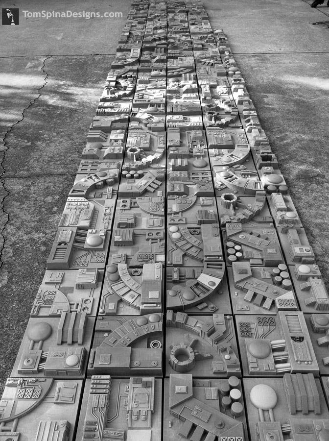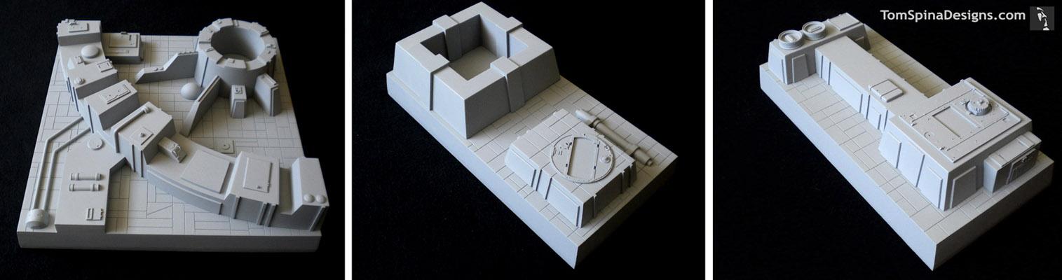 What's especially ironic about these tiles is the similarities they share with the original set of tiles used in Star Wars: A New Hope. The group which would become Industrial Light and Magic (ILM) collected as many pieces of models and glued them together, making certain they were all shades of gray to create an epic indiscernible set of machined tiles to create the Death Star surface.