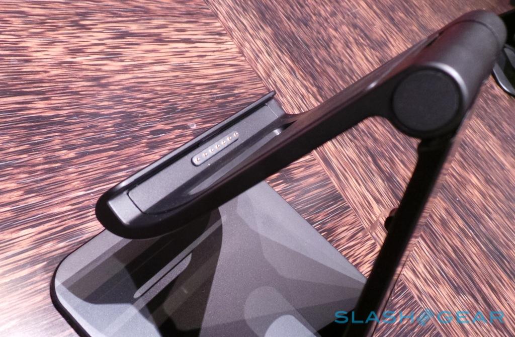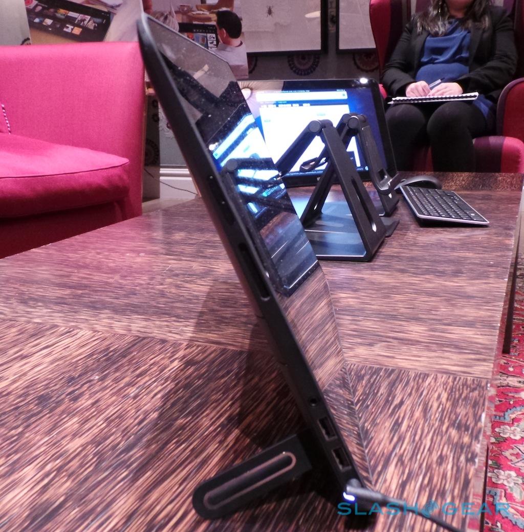 Still, the XPS 18 does have some advantages. At five pounds it's not exactly light for a tablet, but it's half the weight of Sony's model and the battery is rated for almost twice the runtime. That means you can actually hold it with one hand, though you probably wouldn't want to support it that way for more than the minimum of time. Instead, Dell supplies a stand – with a set of power-providing magnetic pogo-pins that charge the slate section – and flip-out feet that can support the XPS 18 either in an upright pose or at a more laid-back angle for comfortable typing. Dell did point out that the rubbery feet on the pre-production units we tried were likely to change, which is good since they were a little slippery on the table.
