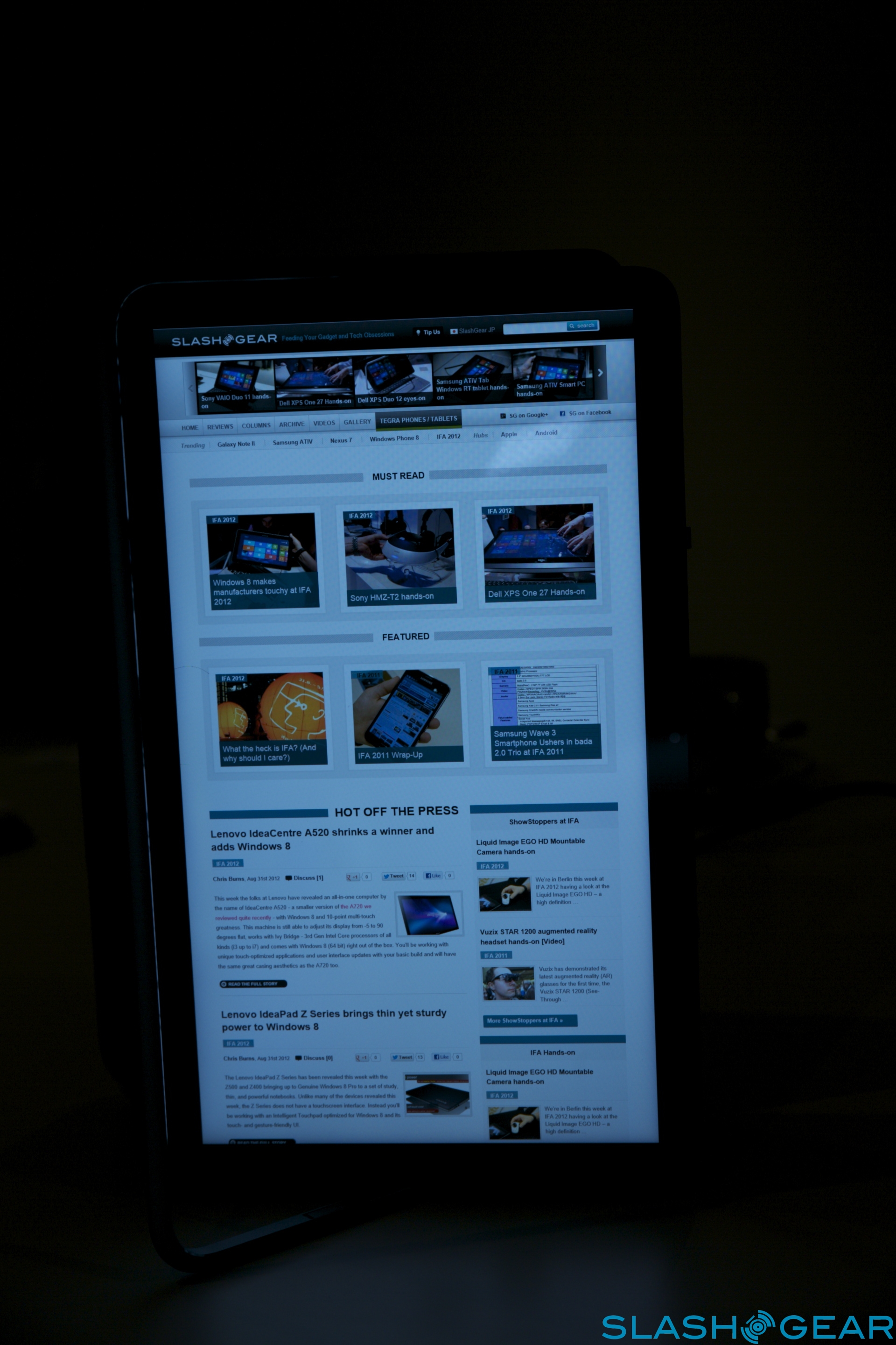 A little pressure in the upper corner of the display, and it rotates smoothly and magnetically clips into place facing the other way. Close the lid, and you've got a tablet; it's obviously heavier than a slate-only device, such as Apple's new iPad, but then you also get a larger display. That delivers 400nit brightness, too, and is incredibly detailed and clear (so bright, indeed, it was difficult to photograph): websites look great (and you can use multitouch gestures to navigate them, of course) as does text whether you're using the XPS 12 Duo as an ereader flipped into portrait orientation, or for creating content in apps like Word or PowerPoint. Keep the screen in tablet mode but leave the lid open, meanwhile, and you can use the XPS 12 Duo for presentations, controlling them from behind the display.