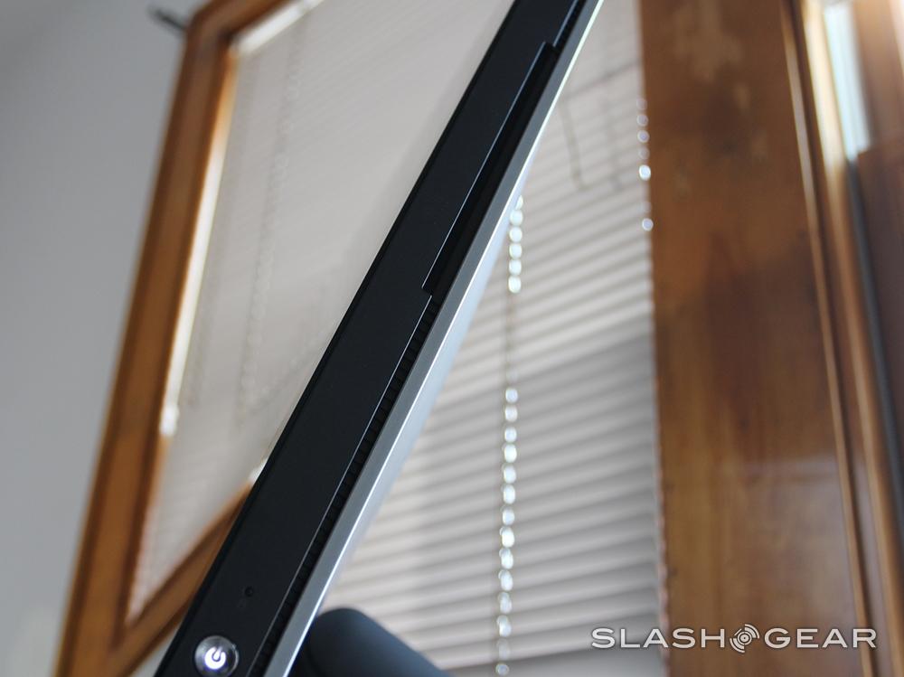 Up on the front you've also got a set of four relatively hidden buttons that are capacitive and only appear when you tap them. The first two buttons increase and decrease the brightness of your display, the third controls the input of your display (if you're using your HDMI-in, for example), and the last button will eject a disk from your disk drive, no questions asked. Each of these buttons is marked with an LED light that, again, only appears when you tap it.