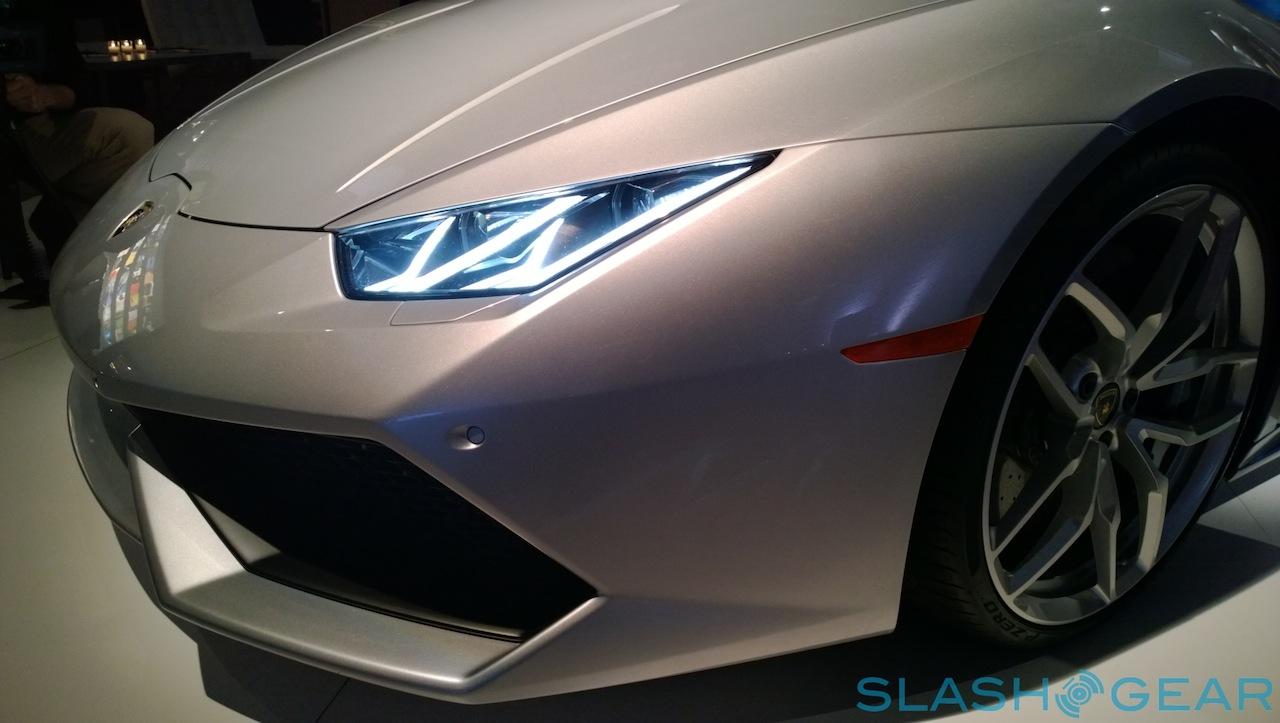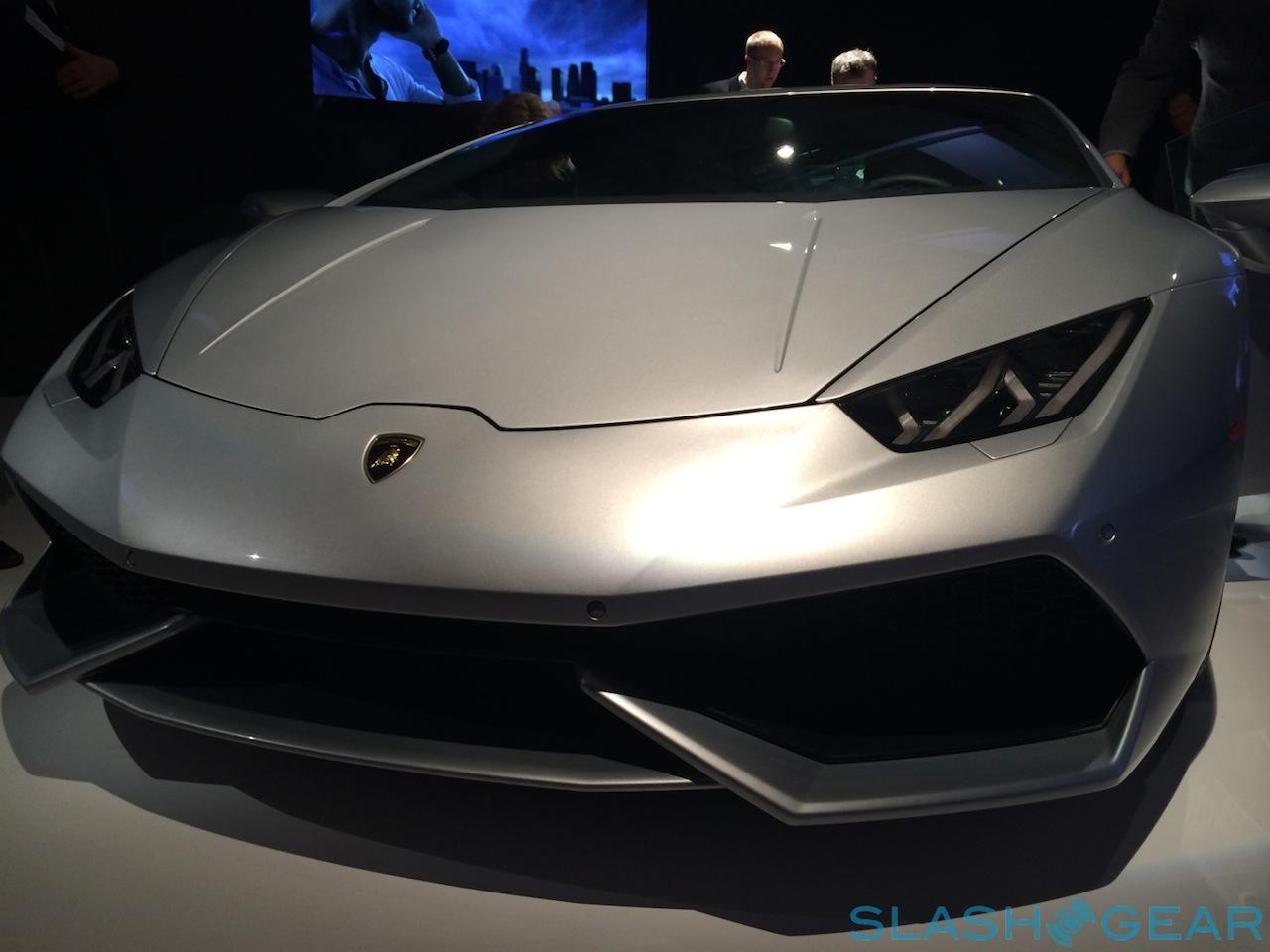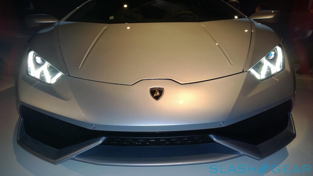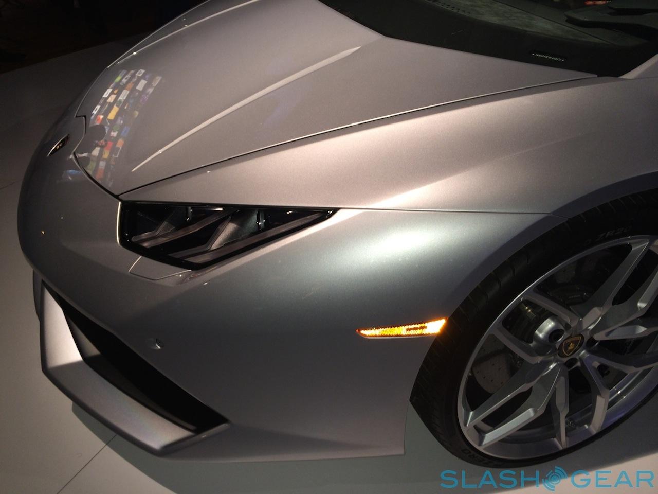 So, you get an updated version of the fighter-jet style lamps front and back, first shown on the Aventador, as well as muscular haunches and a rear three-quarter silhouette reminscent of the Countach.