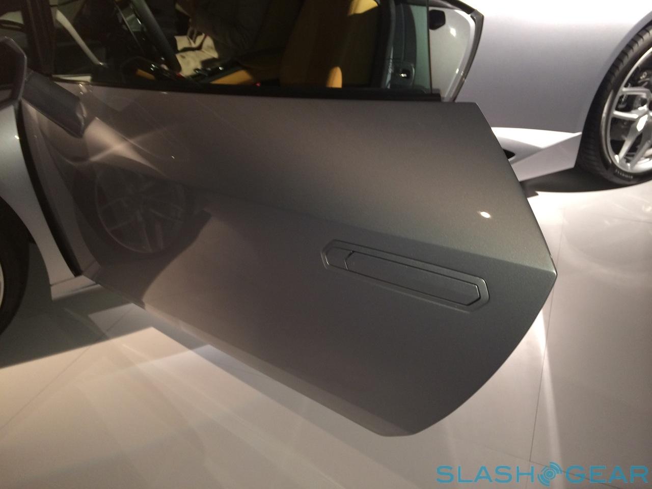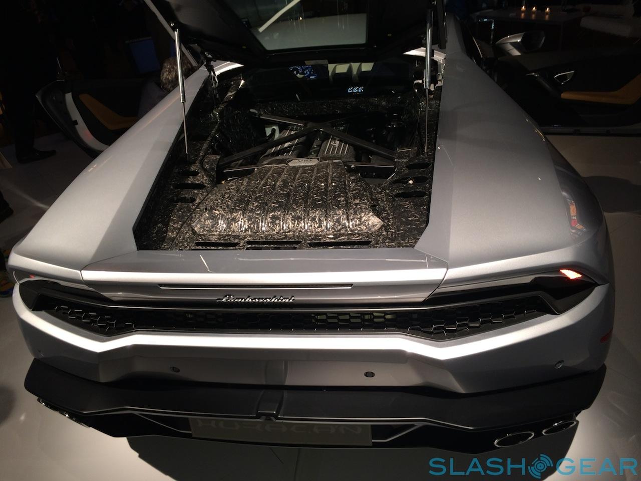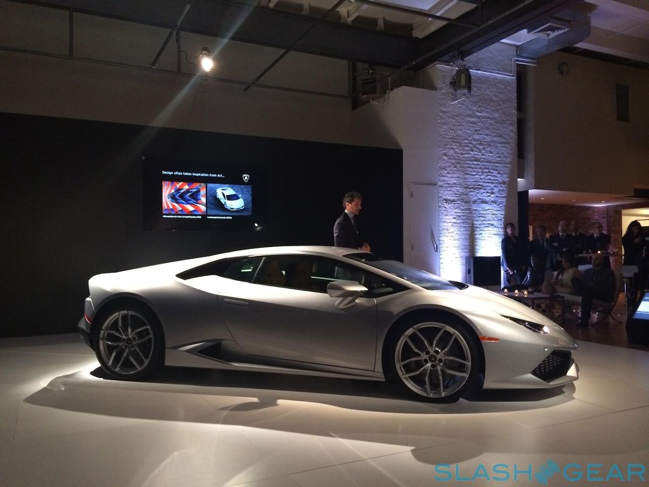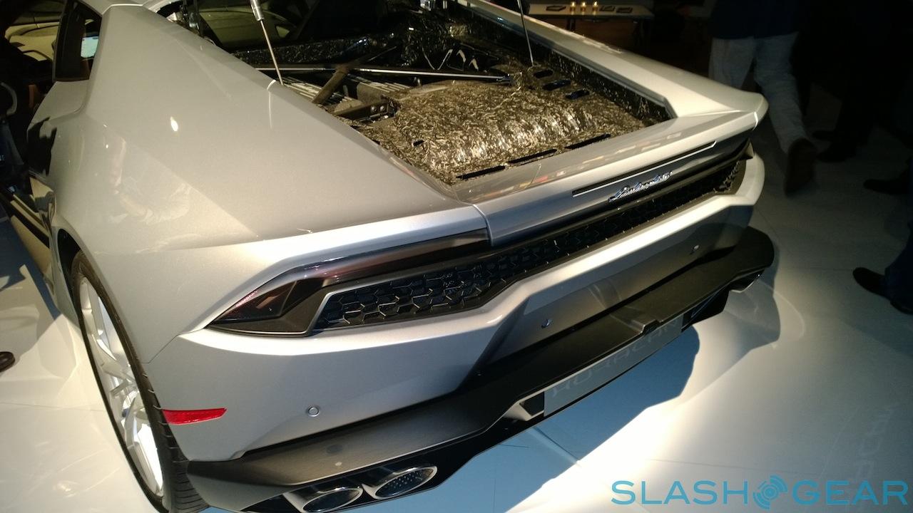 So, you get an updated version of the fighter-jet style lamps front and back, first shown on the Aventador, as well as muscular haunches and a rear three-quarter silhouette reminscent of the Countach.