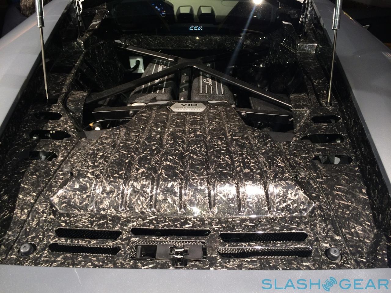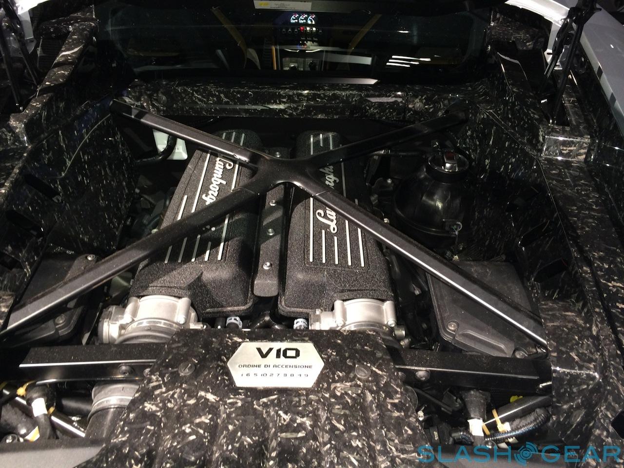 There are also neat details like the angular recessed door handles, and a choice of engine hood finishes. As standard it's matte finish slats, but Lamborghini will also offer an optional clear version complete with a forged composite engine bay.