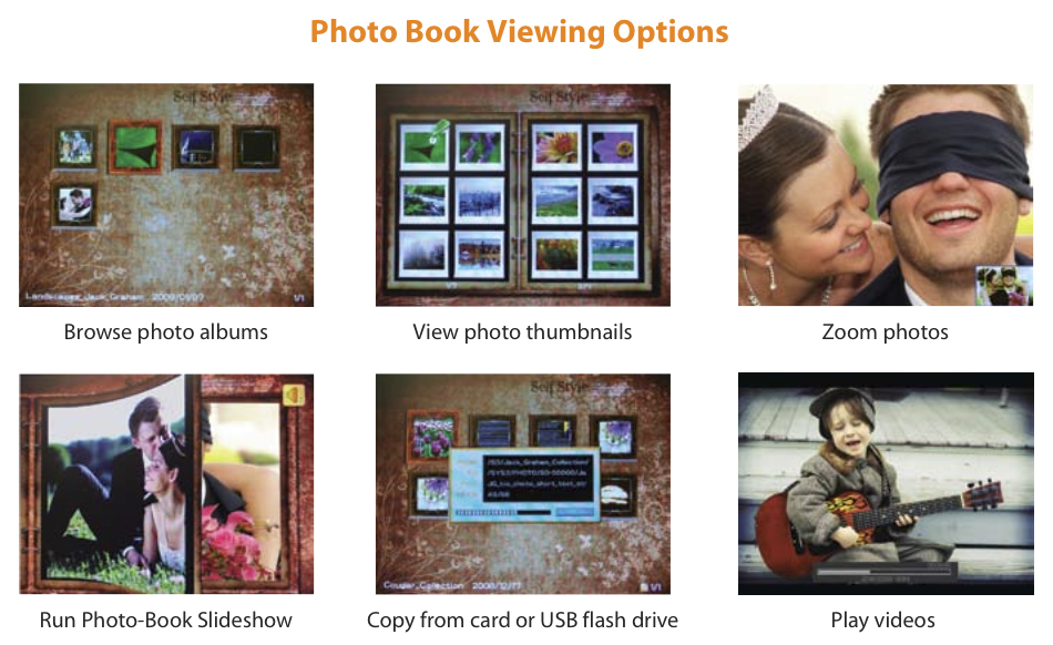 - Copy albums directly from memory cards for USB flash drives to internal memory without needing a computer.