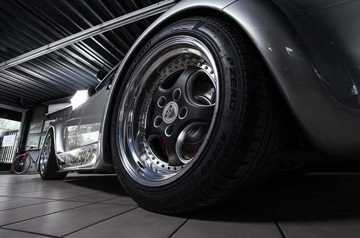 It rides on a coilover H&R suspension and uniball strut bearings. Wheels are 3-piece RH alloy units in 18x9 with 245/40-18 tires on front and 18 x 12.5 with 335/30-a8 tires rear. Inside the car has a custom interior with Clubsport roll bar and special 935 Lollipop seats.
