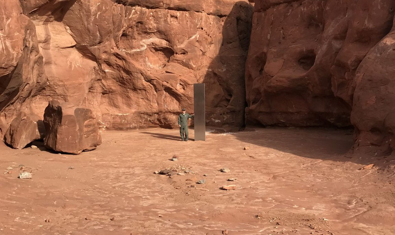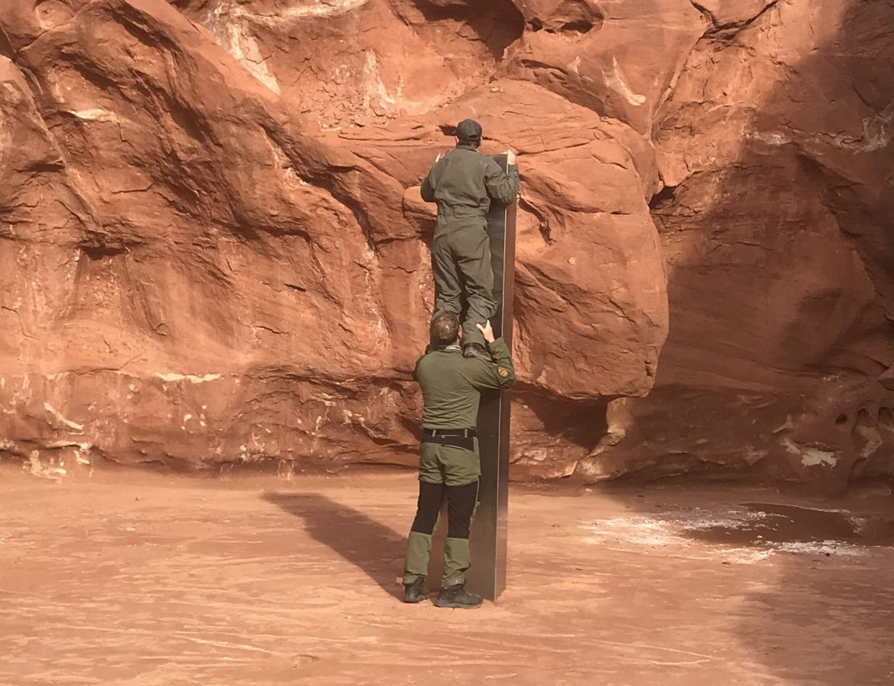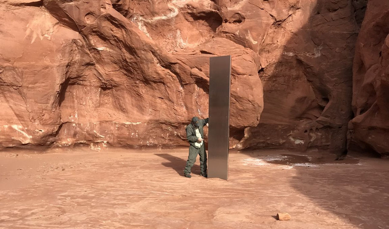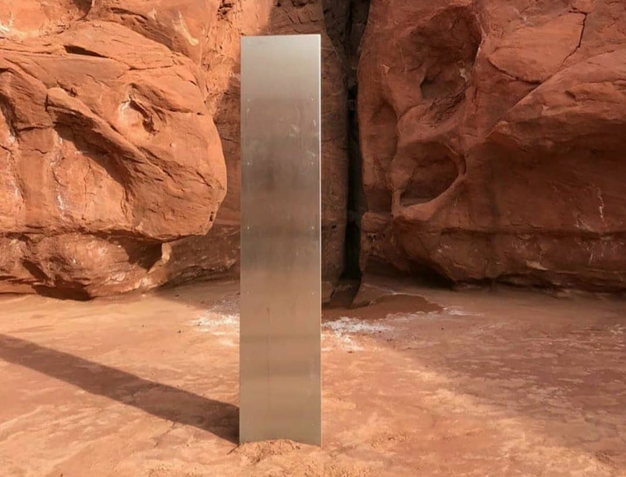 When they saw the unusual object, they landed to investigate what it might be. They discovered a tall and narrow silver monolith installed in the ground in a remote area of red rock. The monolith in the classic movie was black. The one found in Utah is silver and looks like brushed stainless steel.