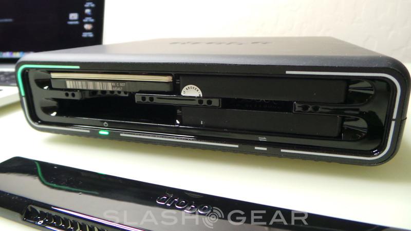 Up front there's a magnetically-attached front cover, which hides four 2.5-inch drive bays. By switching from the more common 3.5-inch drives, as in the rest of the Drobo range, the company has been able to reduce size, noise, and power consumption (though since you provide the HDDs yourself, that will in part depend on which models you pick). However, it also places new limits on capacity, since 2.5-inch drives aren't available in the same huge sizes as their bigger brethren.