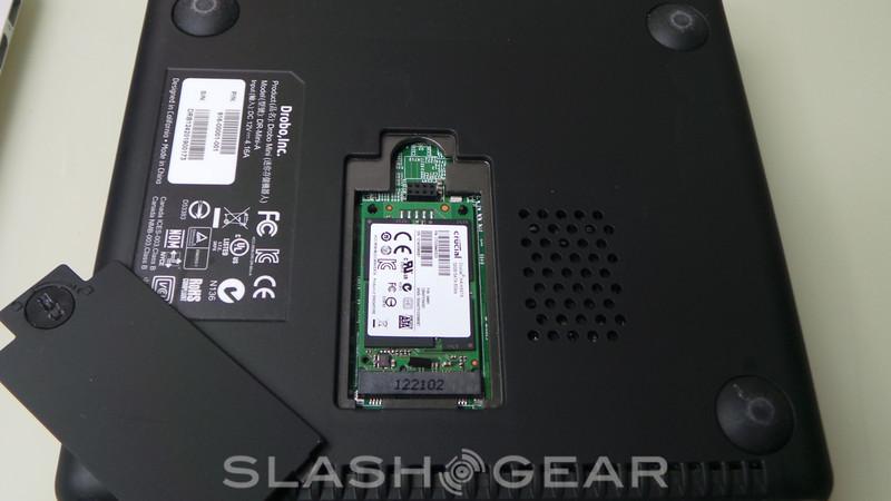 However, there's also a fifth bay, on the underside of the Drobo Mini, which takes an mSATA solid-state drive. These flash drives, having gained in popularity thanks to ultrabooks, basically offer a chunk of speedy storage in a small footprint, and work with what Drobo calls "data-aware tiering technology"; offered until now only on the company's enterprise-spec B1200i, that uses an SSD cache to speed up file access by storing frequently accessed data (such as thumbnails) in a dedicated area of faster capacity. Drobo offers a $169 60GB mSATA, though you can shop around for a better deal, and using the bay is optional.