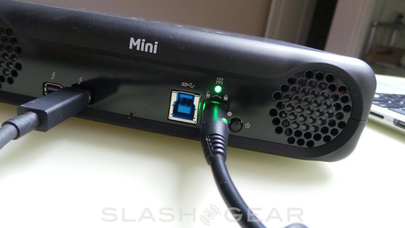 Ports are all on the back, sandwiched between two non-user-removable variable speed fans, which spin with a noticeable hum. As well as a single USB 3.0 port there are two Thunderbolt ports, the second Thunderbolt intended for daisy-chaining drives and other peripherals. The obvious omission – as with most of Drobo's earlier products – is a network port, with the Mini really intended for use with a single machine at any one time.
