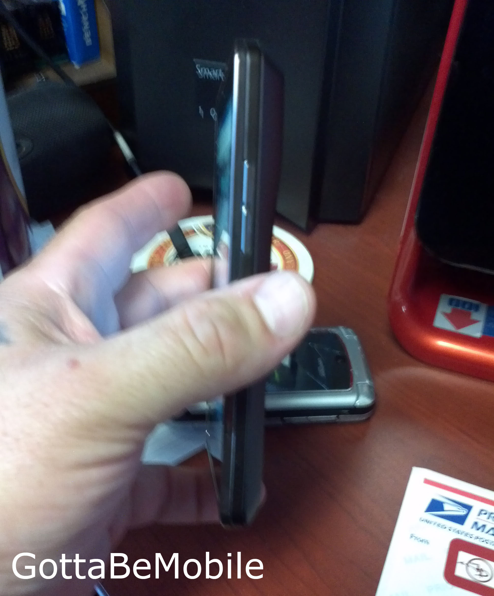 What the newest set of photos shows is again the possibility of curved glass on the front of the device as shown by the light hitting the front lower left of the device, as well as the Verizon logo in the lower right, Motorola in the center on the top near the speaker grill, an at least reasonably bright display, four Android buttons below, and a standard looking border around the whole screen. Along the left side of the device you'll see a recognizable microUSB and microHDMI post combination, this indicating that docks similar to that which we've seen on the Motorola ATRIX and Motorola PHOTON 4G will be in order – this same setup can be seen on the side of the recent DROID 3 just released on Verizon as well.