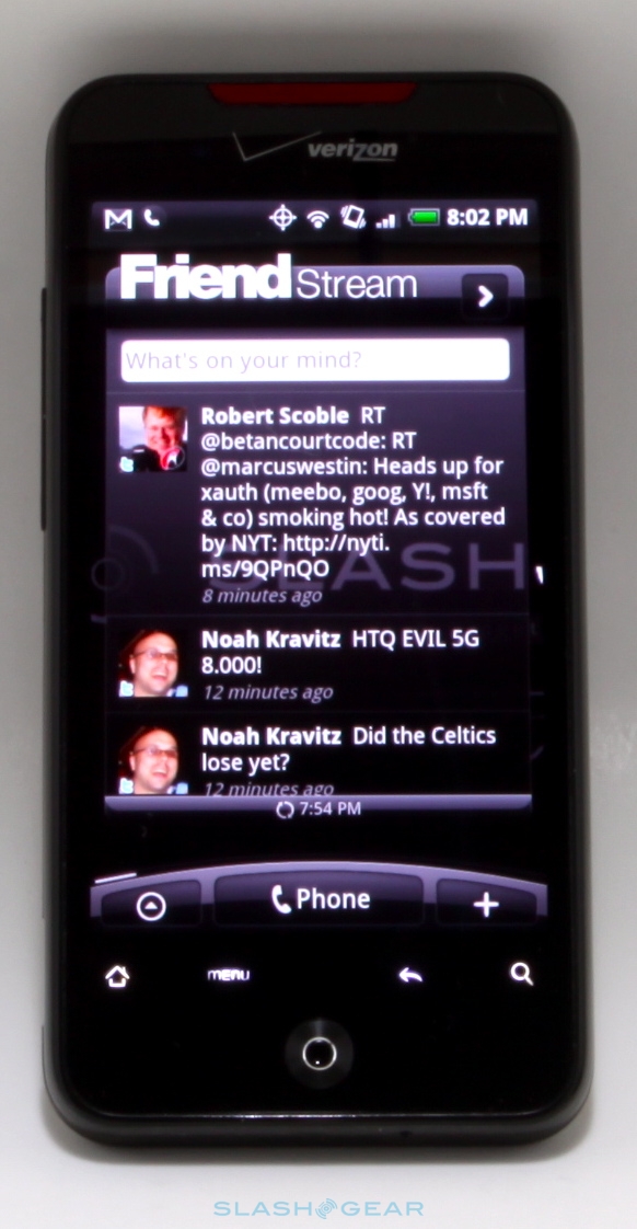 What's interesting is that we're expecting Google's CDMA Nexus One to arrive imminently, and the most obvious difference between the two will be HTC's use of their home-grown Sense UI. Initially limited to T-Mobile USA, now also on AT&T, the Nexus One runs the bare Android 2.1 OS, and while it's a more attractive, usable proposition than earlier iterations of the platform, it's still nowhere near as intuitive out of the box as Sense makes things. As well as adding an extra two panes to the homescreen, Sense packs a preloaded Twitter client in the shape of HTC Peep, Flickr and Facebook integration, and a Friend Stream app which pulls all your contacts social network updates into a single timeline (complete with a desktop widget and the ability to update one or more of your own profiles with just a few taps).
