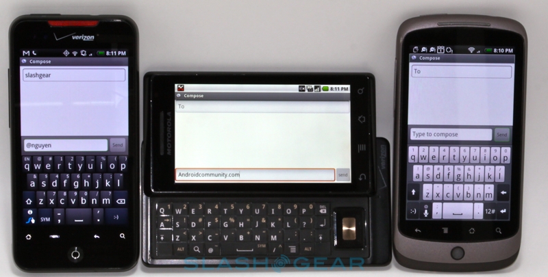 As with the Nexus One, the Motorola runs Android 2.1 with no embellishments (not even the company's own MOTOBLUR social networking integration). While you could argue that the DROID's slide-out hardware QWERTY keyboard makes it a more proficient messaging device, HTC's updated Mail client actually pushes the Incredible ahead in our opinion. Although 2.1 has native Exchange support, it's only for email and contacts; the HTC app adds in calendar sync too, and the mail app itself allows you to view messages organized by whether they're flagged, unread or from certain "VIP" contacts, or if they're meeting invitations, and there's a threaded "conversation" view too. Although the Motorola's QWERTY is fair, HTC's standard on-screen keyboard is a pleasant boost over and above the regular Android QWERTY – thanks to improved auto-correction – though we're also fans of Swype on which we're actually faster than with a hardware 'board.