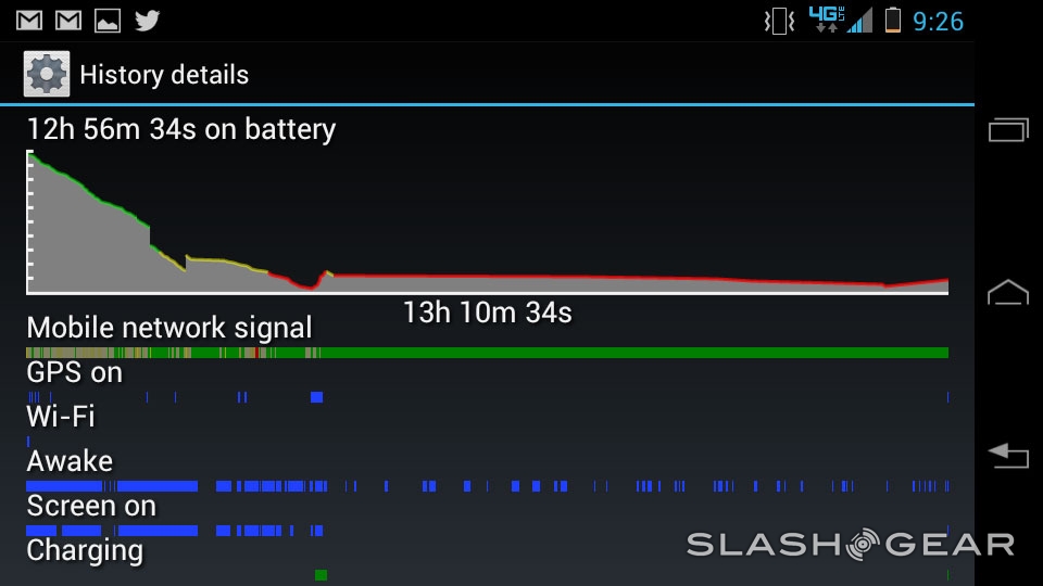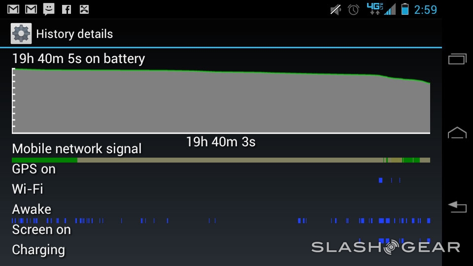The battery is a massive 2000mAh and, in combination with the amazing ability of the Snapdragon S4 to keep itself on low-demand while the device is asleep, you'll have so much standby time that you'll freak out. See here first what happens when you use the device moderately – lots and lots of time.