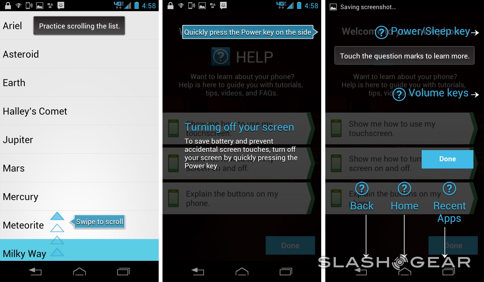 Below: Motorola includes an easy start guide for anyone unfamiliar with Android in general but especially with their unique user interface. They've made it specific to this device, too, with perfectly pointed arrows at the buttons outside the display.