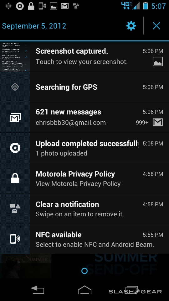 Android 4.0 Ice Cream Sandwich provides you with a Recent Apps button so you can easily switch between apps on the go. It also brings a notifications pull-down menu that's accessible from your lockscreen as well as your homescreen – there's a quick access button there to get to your full settings as well. There's a new feature brought on by Motorola here as well which, when you pull your homescreen over to the right, you get a Quick Settings menu with on/off switches for GPS, Mobile Data, Bluetooth, and other oddities as well.