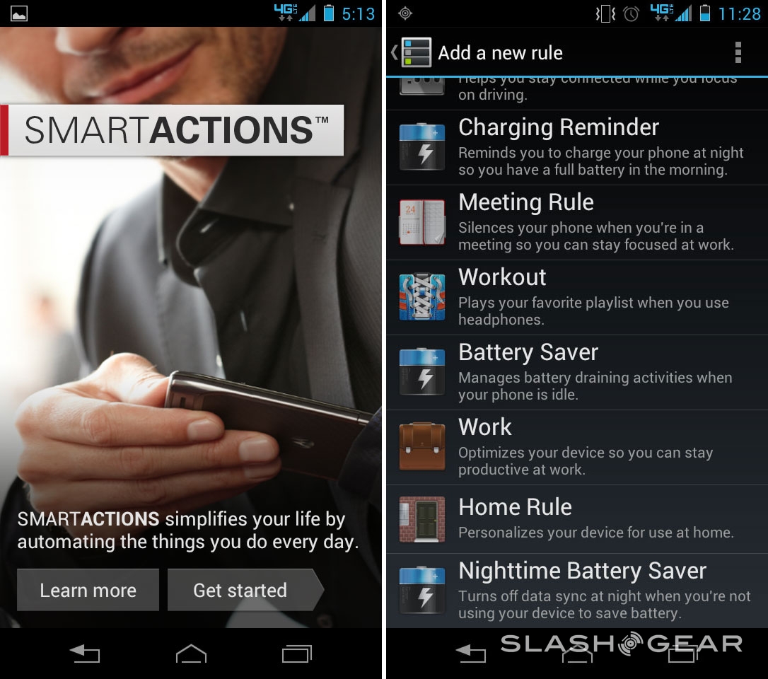This device works with Smart Actions like several Motorola devices before, this app able to do things like detect when you're in a certain area (GPS located) and turn your device's brightness down. You can turn your sounds down when you enter a meeting (according to your Google calendar event), you can set a notification to pop up to remind you to charge your phone at a certain time of day, and you can turn off data sync when you're asleep – amongst many others. You've also got Voice Commands and Voice Search as provided by Google's newest Android systems. Note here that this device has been guaranteed to get Jelly Bean by Motorola, but that it currently uses Android 4.0.4 Ice Cream Sandwich.