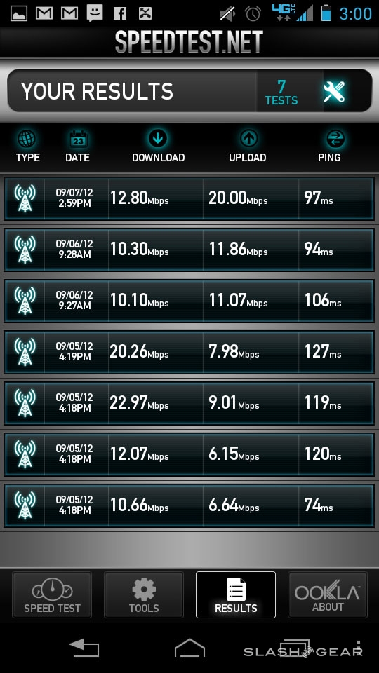 The DROID RAZR M works with Verizon's 4G LTE data network and has proven itself as a rather fabulous internet beast – the danger here will be that you get too addicted to the speed and end up using your whole data allowance in the course of a few days. That's been known to happen with some people, you know. Have a peek here at a set of data speed readings from both New York City (including LaGuardia Airport – also in the demo video above), and Saint Paul, Minnesota.