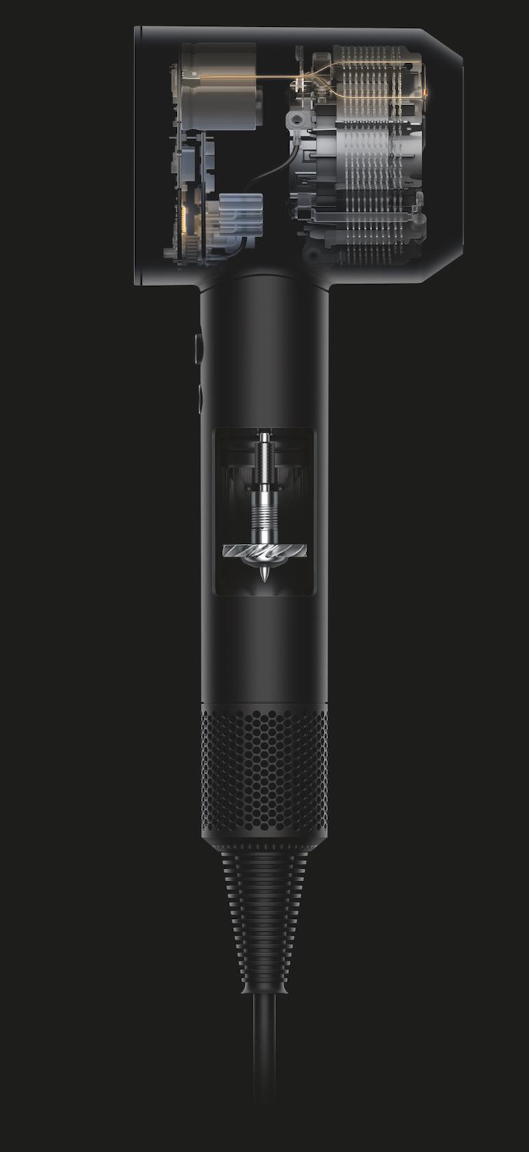 That's the motor, of course, here dubbed the "Dyson digital motor V9" and the homegrown handiwork of more than fifteen motor engineers, apparently. By shrinking it down, they could fit it in the handle of the hairdryer instead of the head; through giving it 13 blades, instead of Dyson's usual 11, it changed the sound in operation considerably.