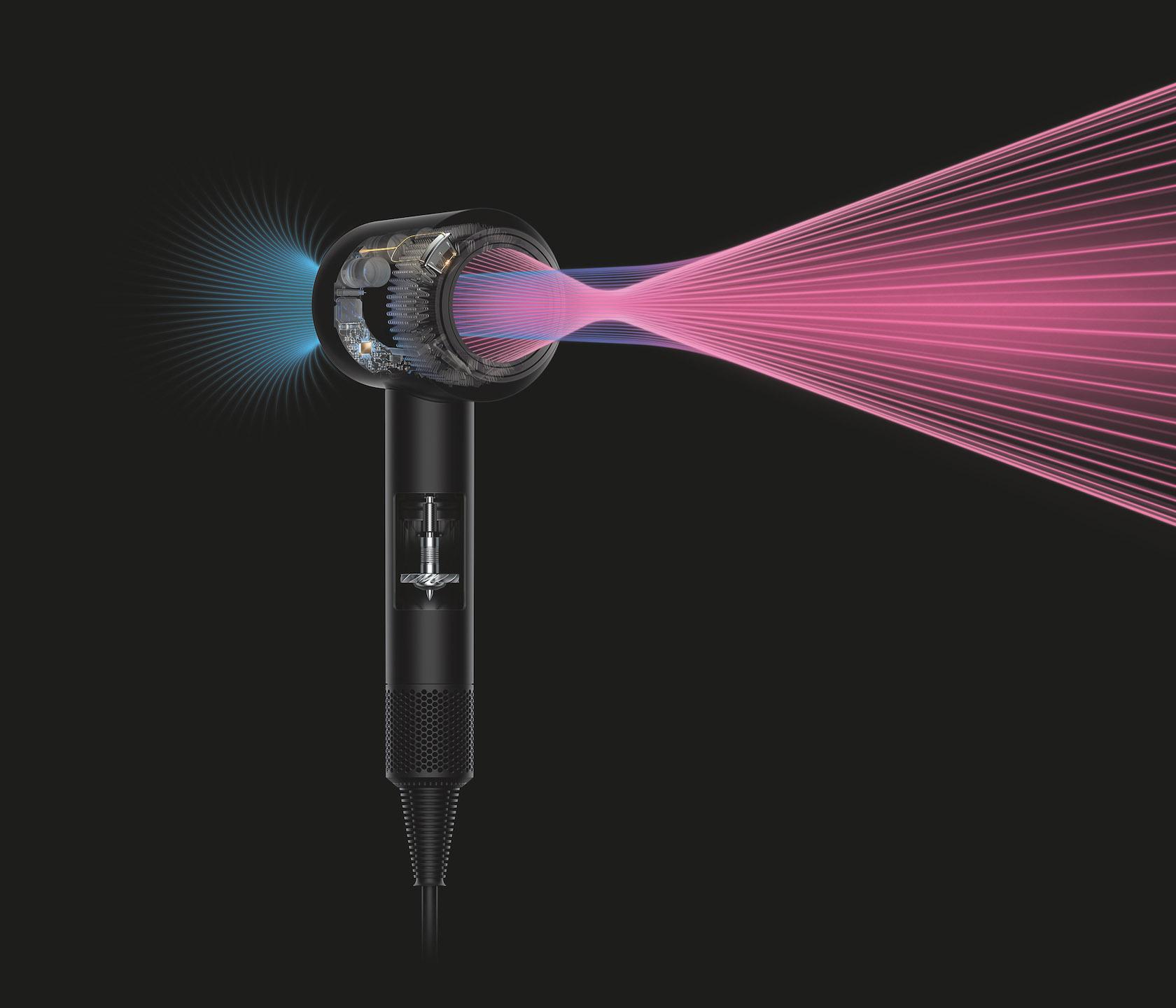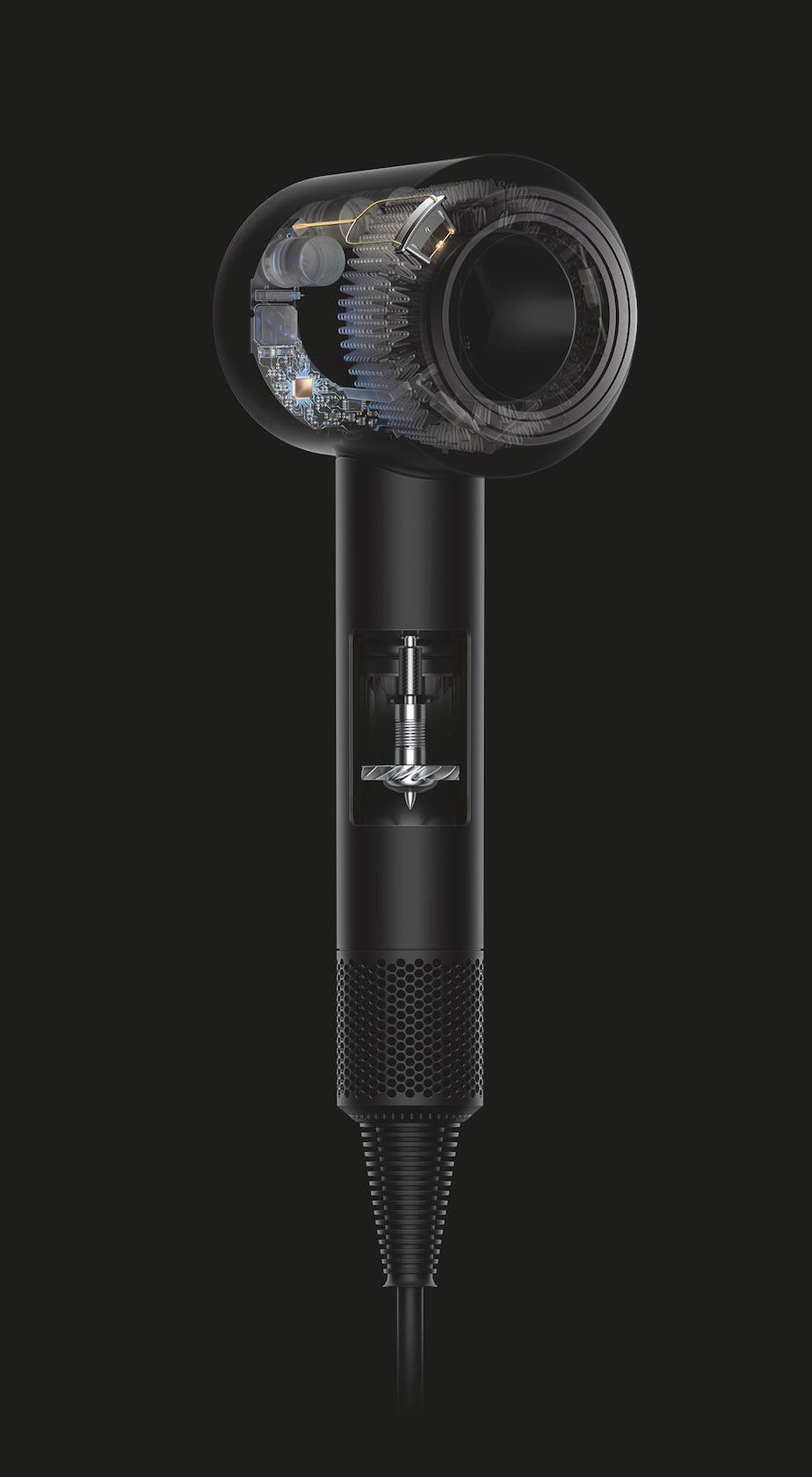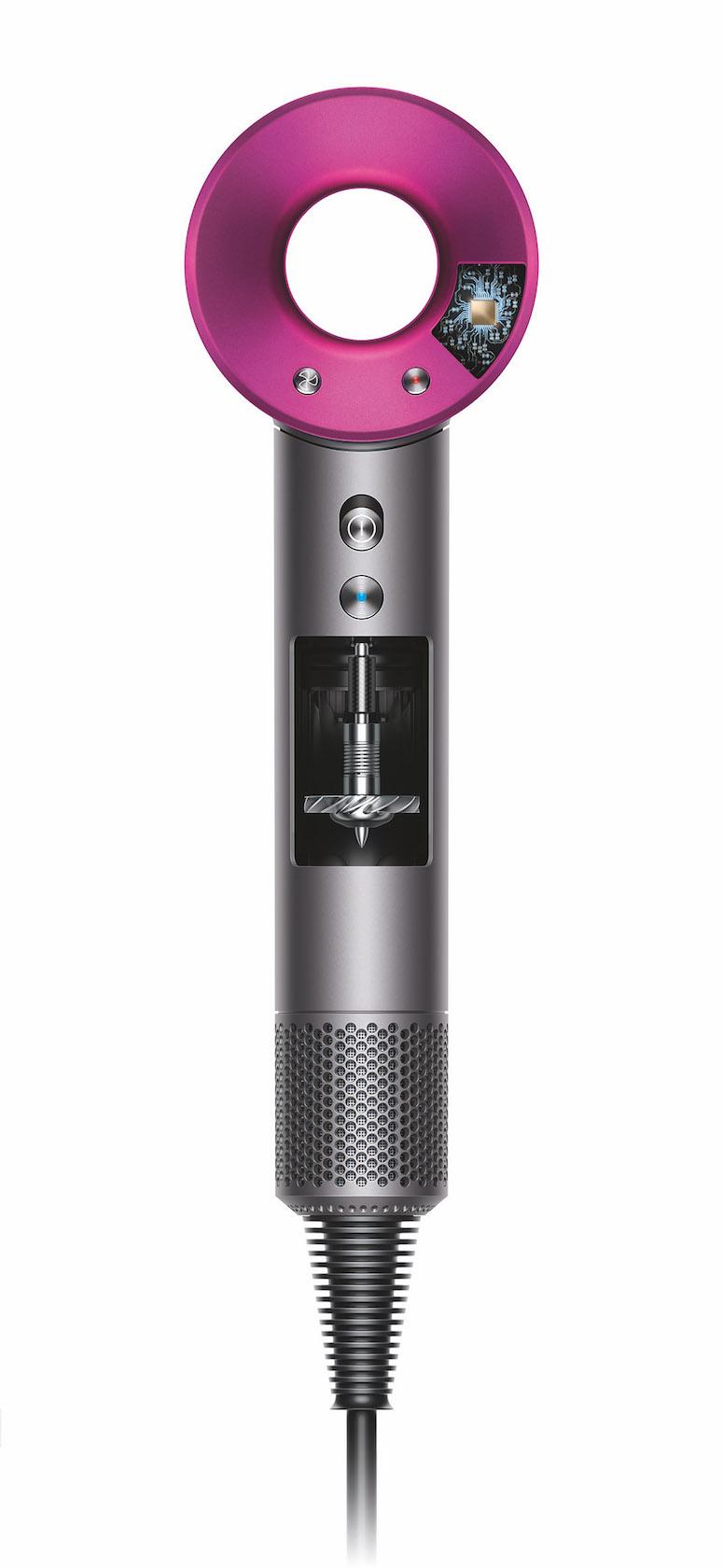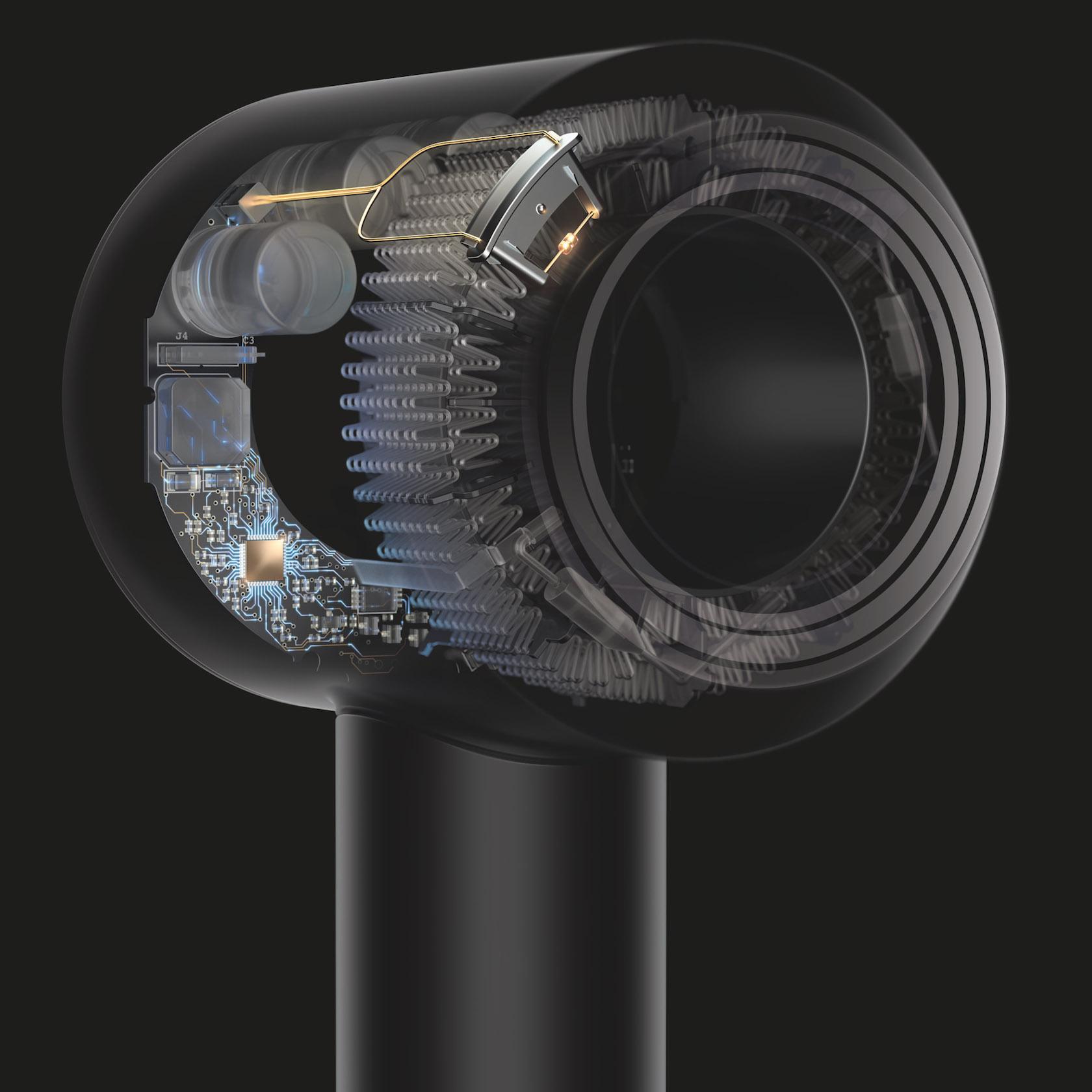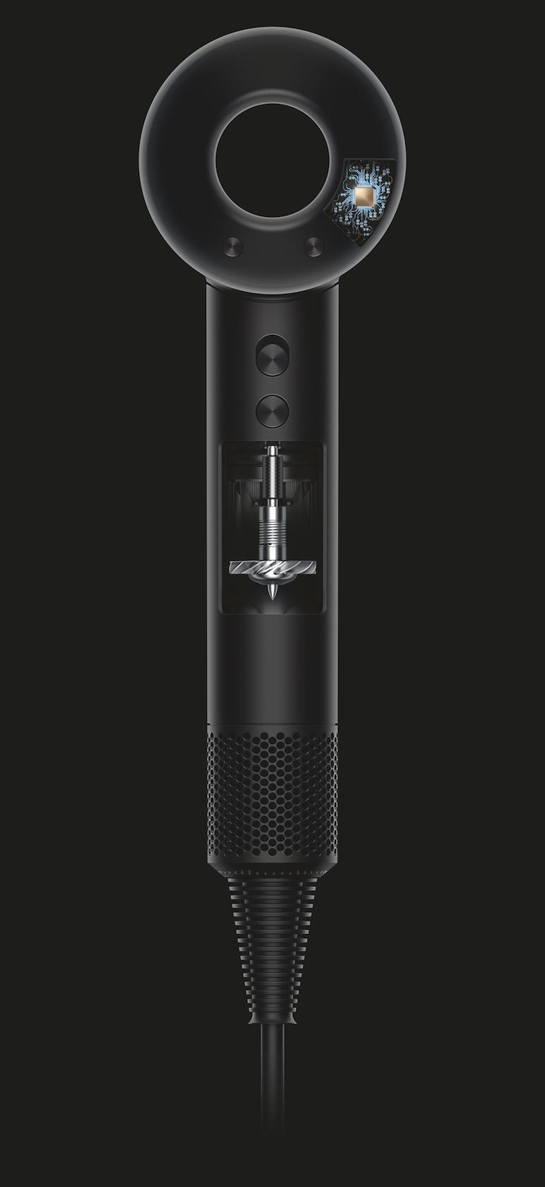 Dyson uses a glass bead thermistor temperature probe to check how hot the air is 20 times a second, adjusting the double-stack heating element so as to avoid scorching hair or the scalp underneath it.
