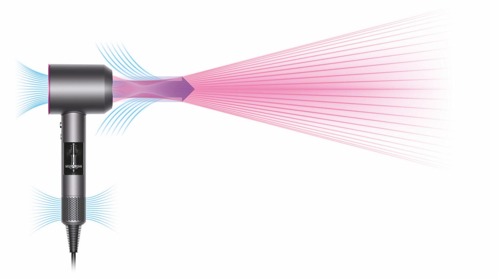 The same Air Multiplier system as used in the company's fans has been brought to bear on your head, pulling in air from the handle and the rear of the dryer to supposedly amplify it threefold and then focus it – at a 20-degree angle – onto the hair. Three airflow settings are offered, along with four heat settings.